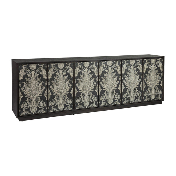 - Features six wood framed fabric covered doors, six adjustable shelves, a ventilated back, and a recessed plinth base.