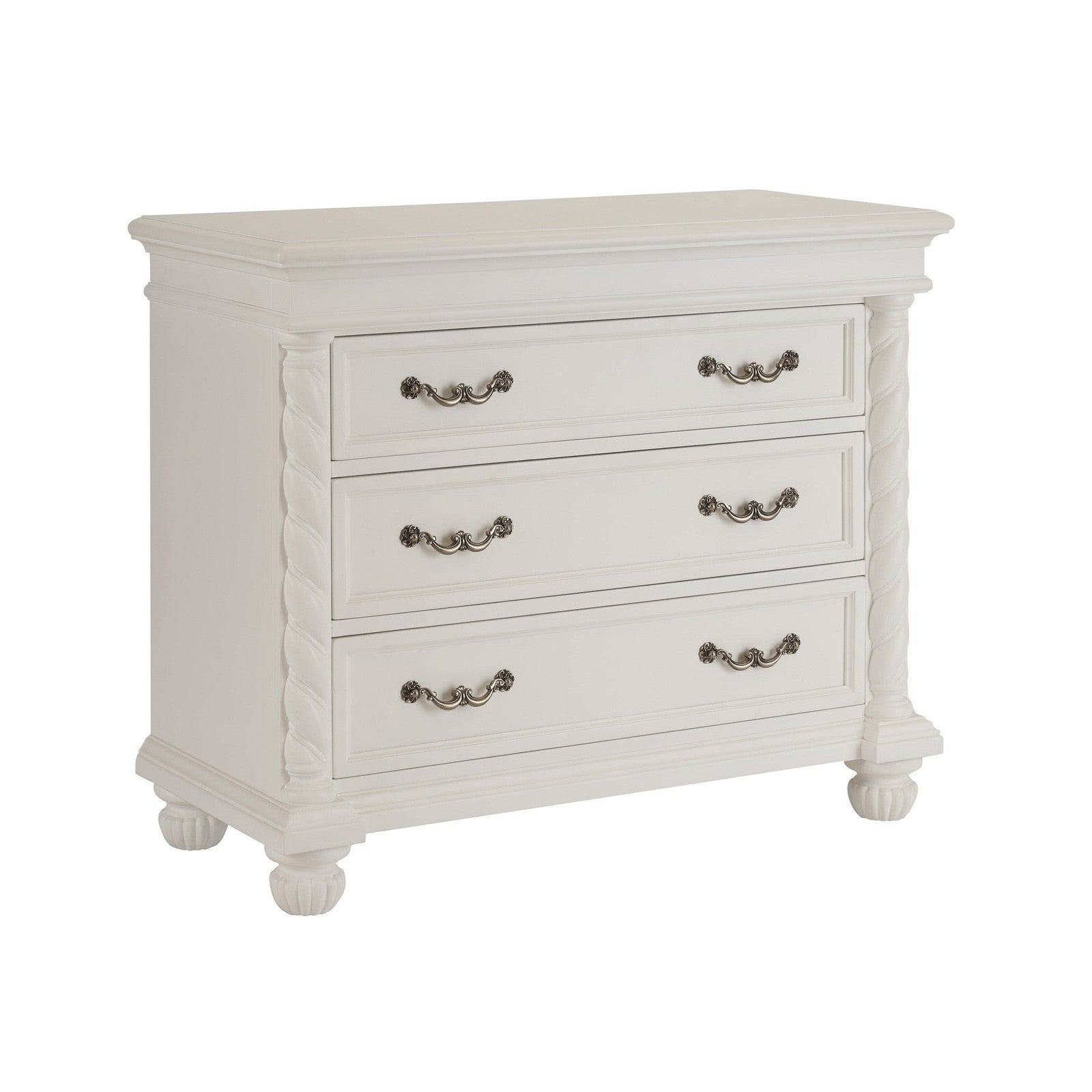 - The piece has three drawers with heavy-duty drawer guides, decorative turned posts and fluted bun feet.