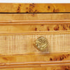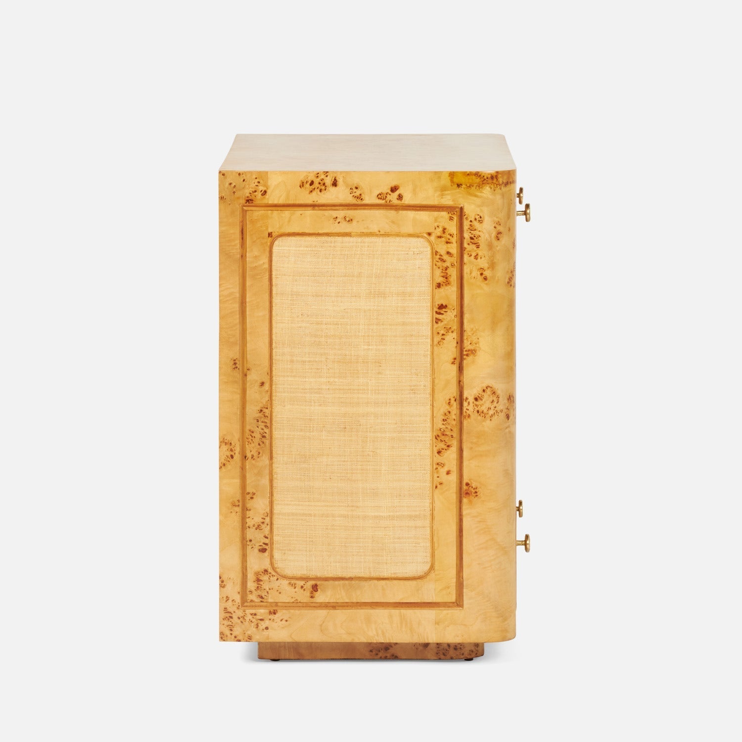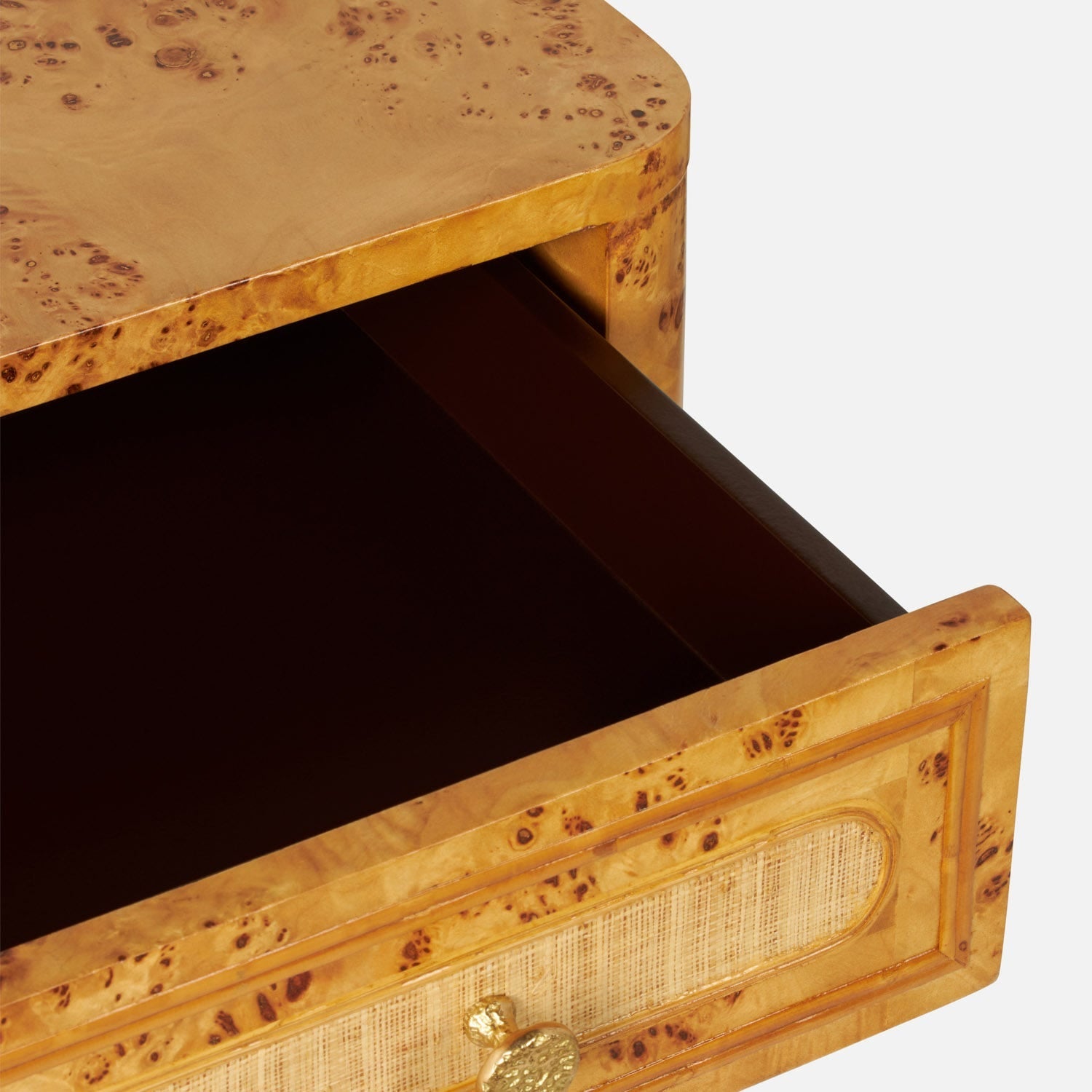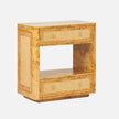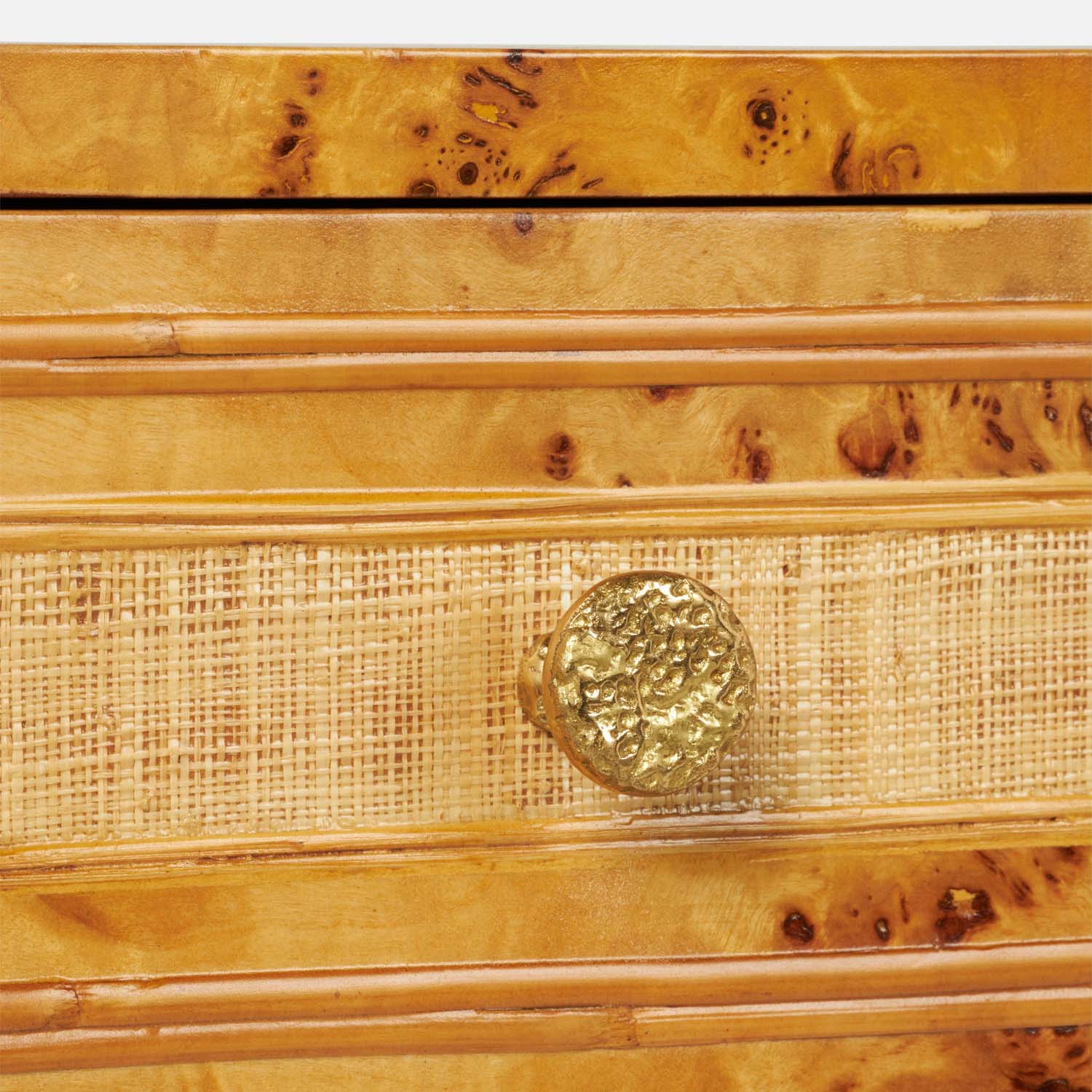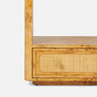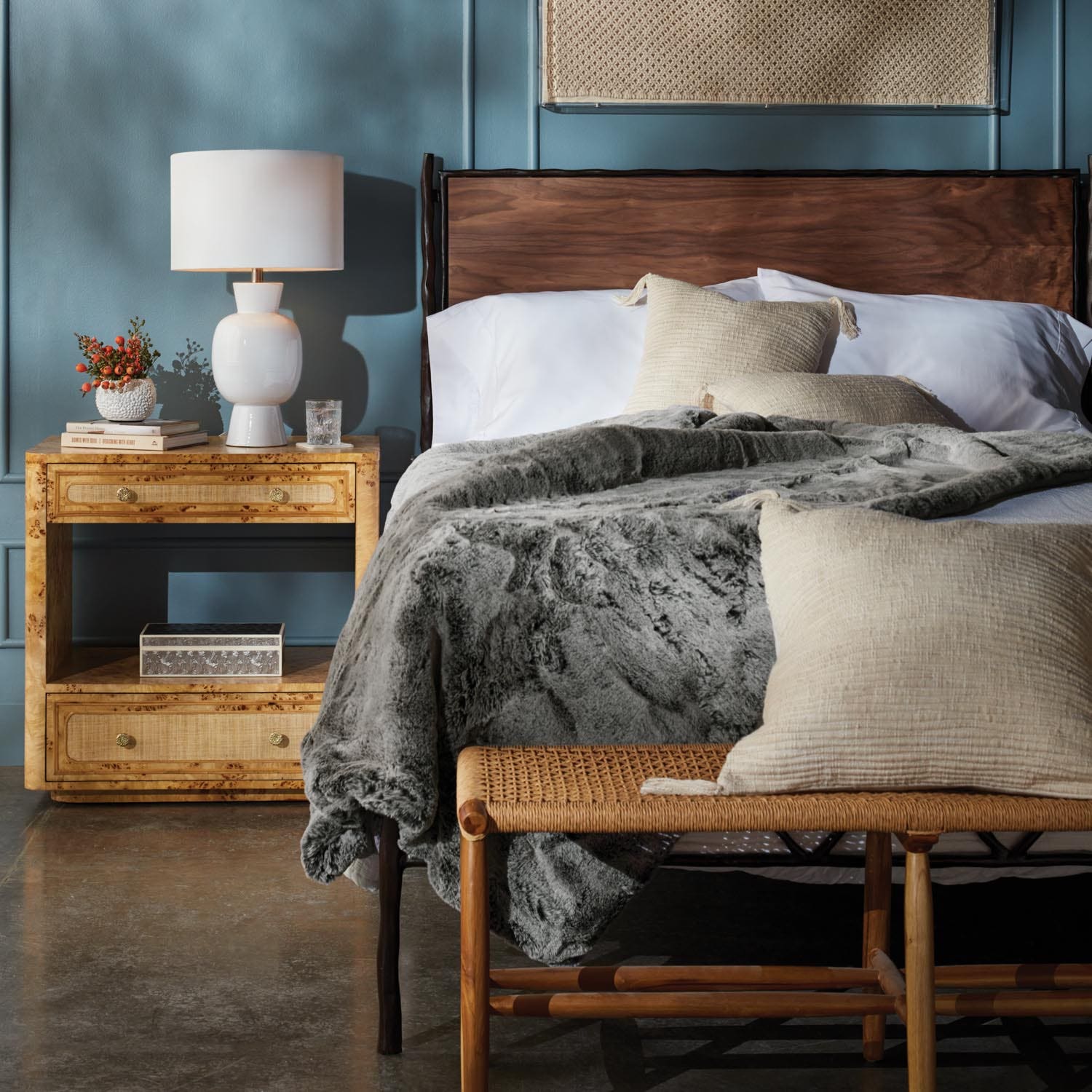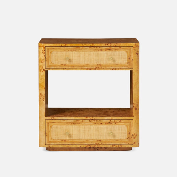 - For the bedroom, the nightstand holds two drawers, both covered in woven raffia.