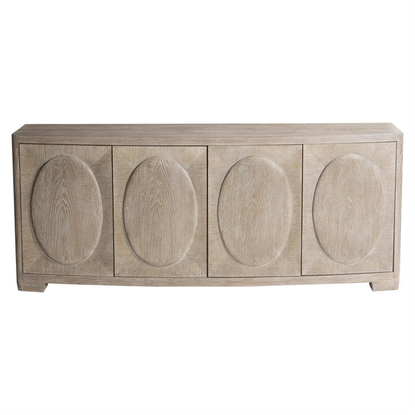 - This bowfront buffet also offers clean lines and a stunning rustic Marcona finish.