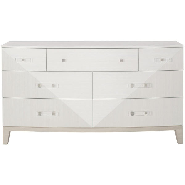 - Linear Grey or Linear White finishes, 7-drawer dresser with poplar solids and engineered faux anigre veneers. Softly curved front, unique inverted pyramid design, and clear acrylic with metal hardware. Adjustable glides, anti-tip kit, and center support leg for stability. Easy care: dust with soft cloth, clean smudges with damp cloth and dry immediately. Dimensions and specifications subject to change. Made from high-quality materials for durability and style. Suitable for bedroom use, with optional mirror support attachment available. Durable construction with fancy face drawer fronts and sleek form.