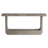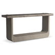 The wood sides of the Azzura console table flow into a rounded base and form a lower shelf. The side panels pierce the stone top, offering a unique style for this modern organic design.