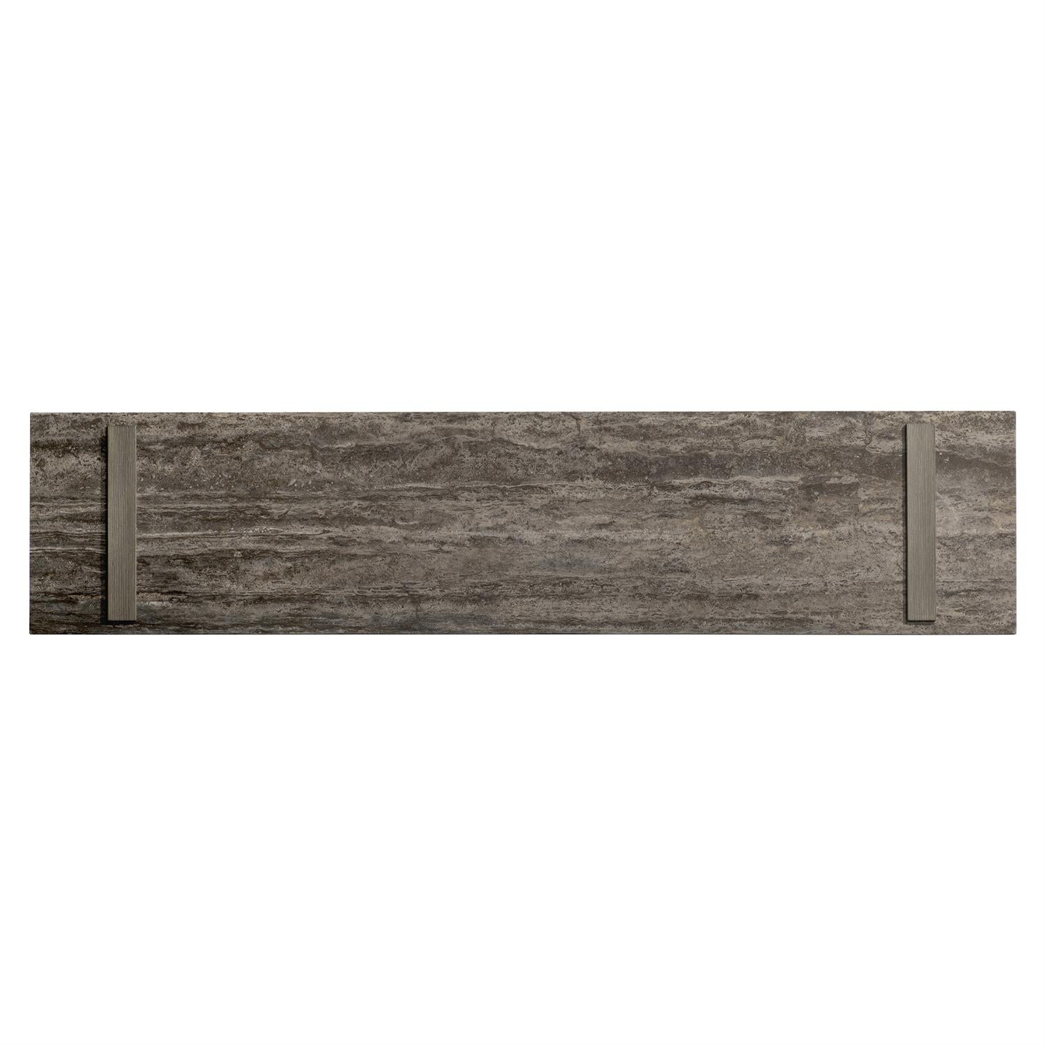 - Honed silver travertine table top, supported by base of oak solids and veneers in