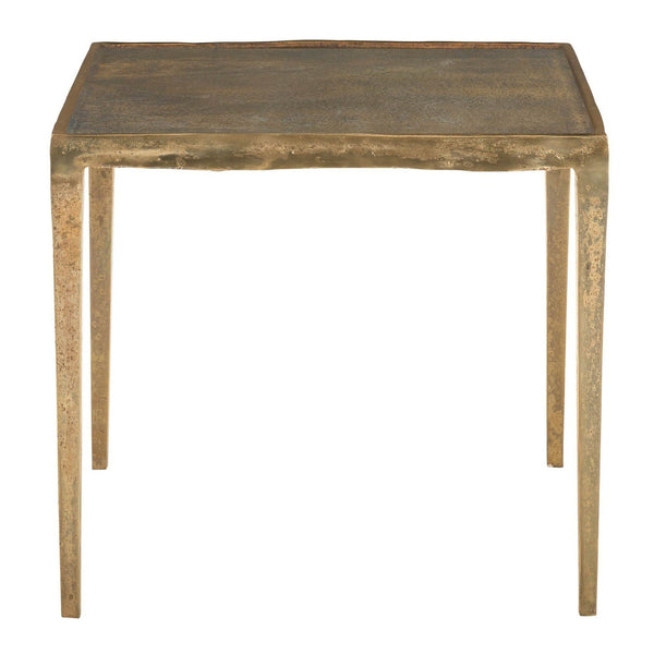 - Crafted from cast aluminum, the Benson square end table features a vintage brass finish that offers warmth, texture and a hint of glamour.
