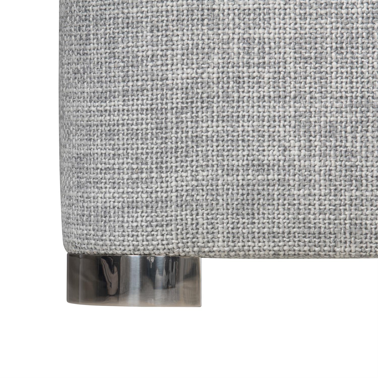 - Polished stainless steel-framed headboard with upholstered inset panel and vertical seam and fully upholstered footboard and side rails