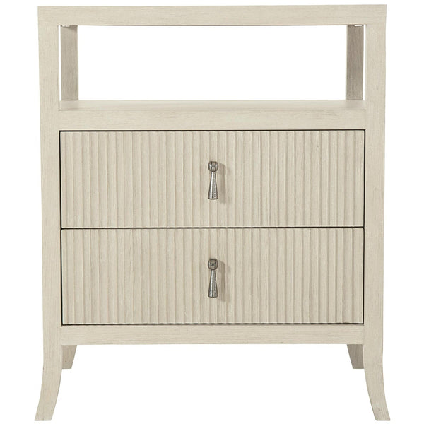 - Cerused Linen finish, 2 drawers, cast beaded drawer fronts, tapered drop pulls in Aged Silver. Modern aesthetic with feminine appeal, soft finishes, and graceful curves. Top compartment open on all sides, glides, anti-tip kit. Made by Bernhardt, part of Grayson Living's curated selection. Remove dust with a soft, dry cloth, clean smudges with a damp cloth, dry immediately. Do not let liquids stand on surface. Specifications subject to change without notice. Dimensions and materials available upon request. Part of the East Hampton collection, this nightstand brings sophistication and refinement to any interior.