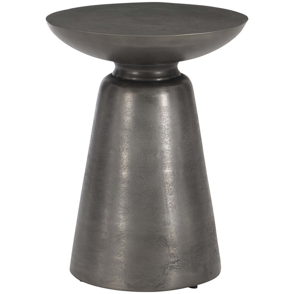 - Cast aluminum in matte graphite finish forms a conical base that supports a vessel-shaped top.