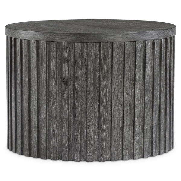 Inspired by a classic drum shape, the Menton side table features deep linear reeding on the sides and a smooth table surface. The design is casual and modern, with an elevated appeal. The deeply textured woodgrain is highlighted by our Sutton finish.