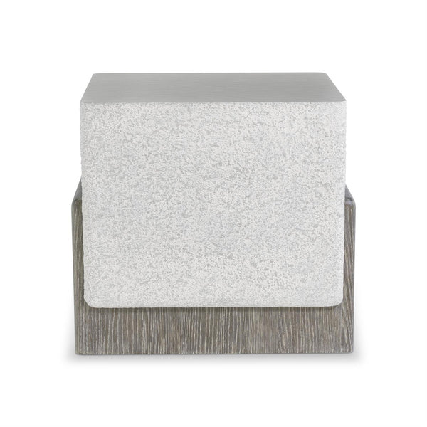The Monolith side table showcases a bold design with a textured faux stone block nested in a wooden base. The top offers a smooth surface while the woodgrain is highlighted in a Puma finish on the base as it curves up to cradle two sides. It's a modern style with an organic inspiration.