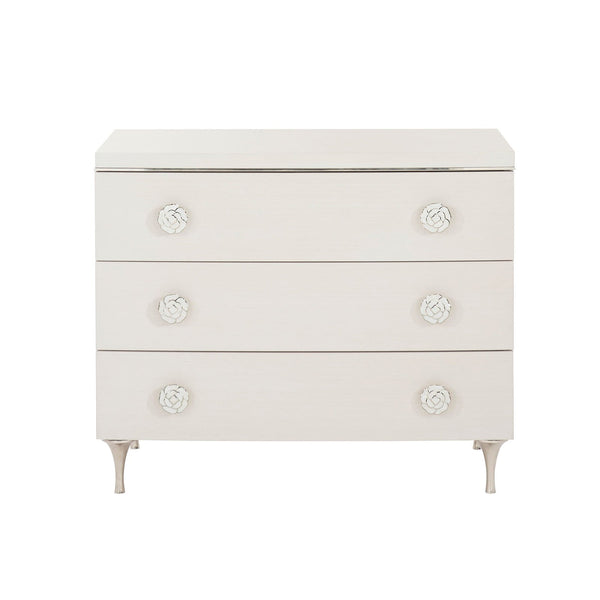 - Oversized floral pulls featuring inlaid kabebe shells add feminine allure to the minimalist design of this glamorous nightstand.