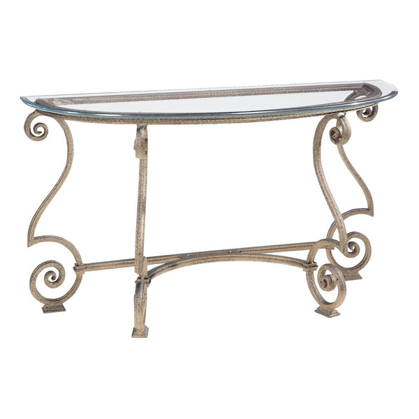 - Elegant and curvaceous, the Solano demilune console table features a scrolled cast iron base supporting a clear glass top with a shaped dupont edge.