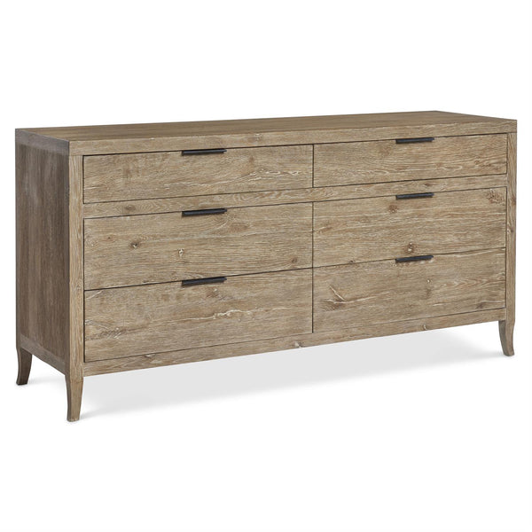 The Tribeca dresser pares traditional design to simpler lines and stunning rustic style. The details of natural wood are highlighted by the Aurum finish. Each of the six drawers has a textured metal pull tab in Barlow finish.
