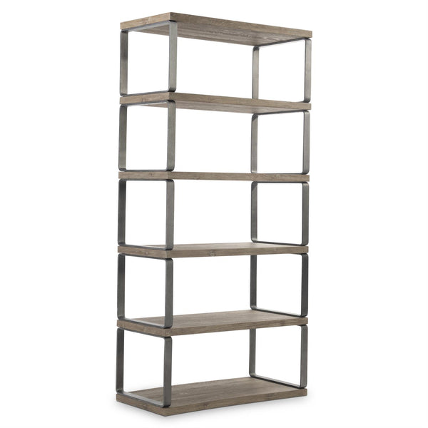 Modern geometry gives the Tribeca etagere a unique style. Open metal squares support five wooden shelves on each side. Natural wood grains are highlighted with the Aurum finish for a organic and rustic design.