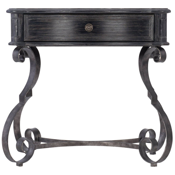 - Inspired by traditional Italian styling, this unique one-drawer nightstand features a scrolled metal base in a Textured Carbone finish.