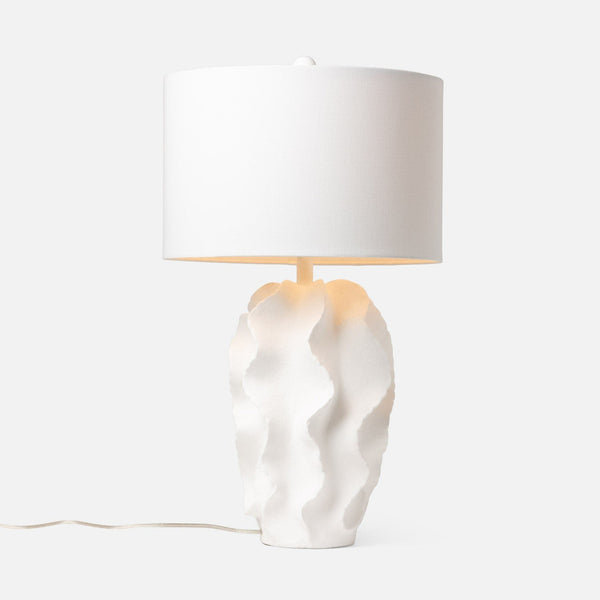 - Undulating curves of mold-cast textured white resin soften the shape of a traditional urn lamp base topped with a linen shade.