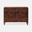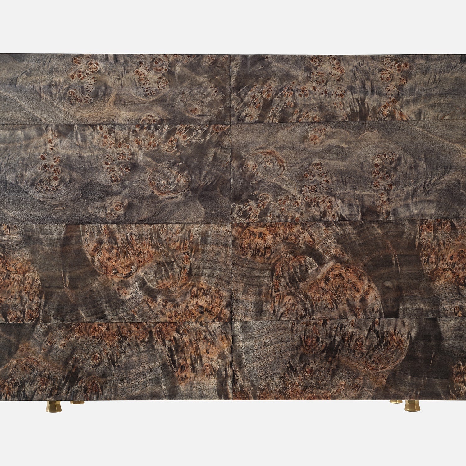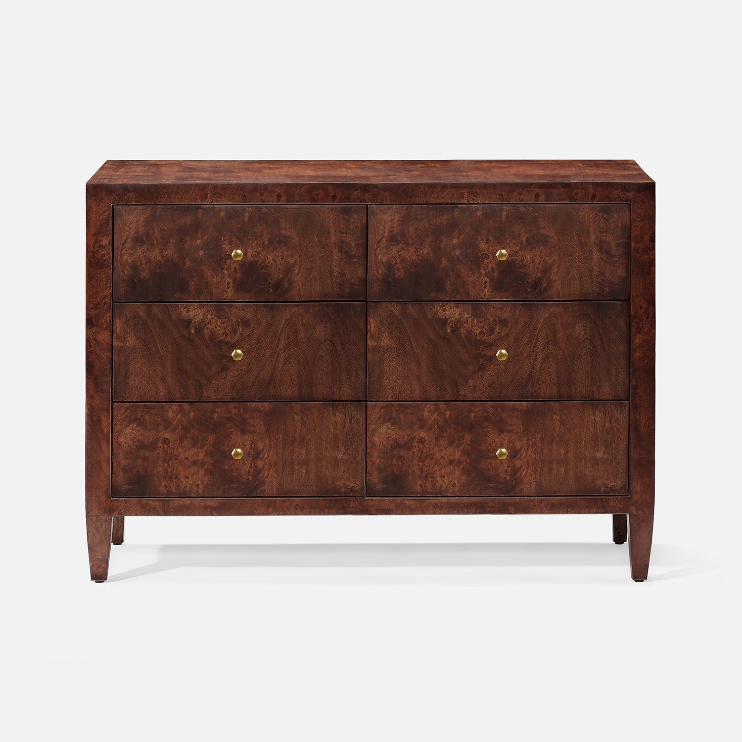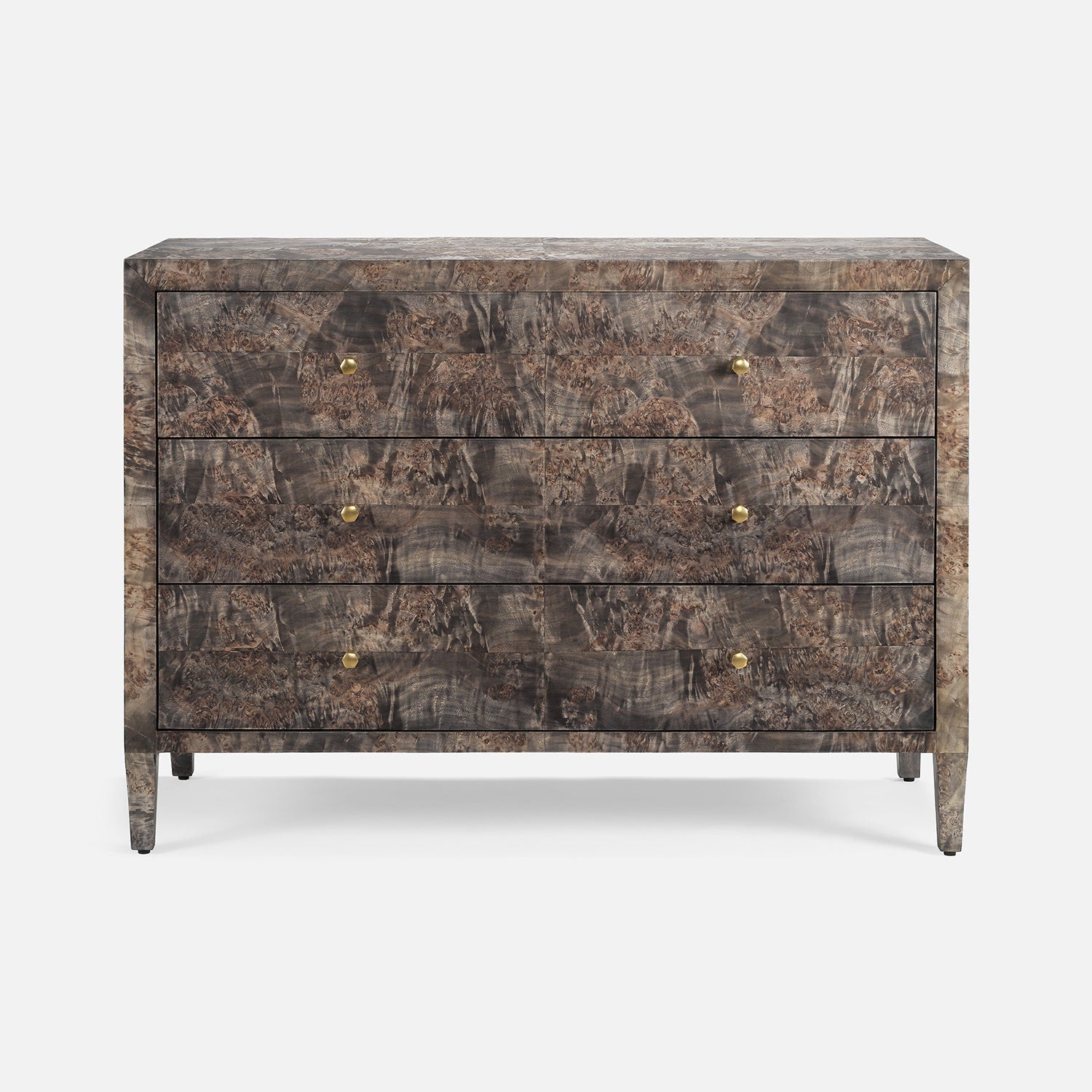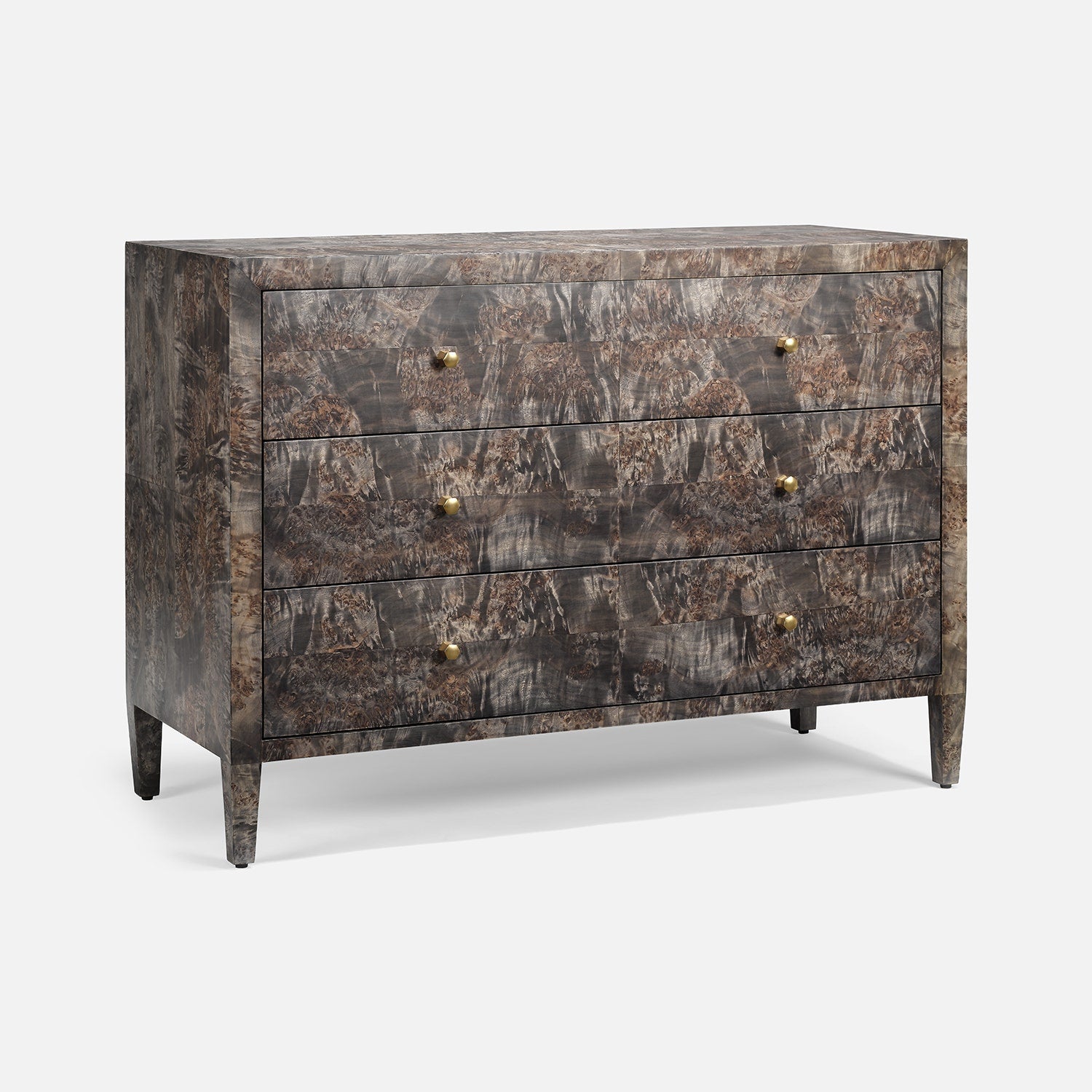 - Made from naturally contrasting mappa burl and a sleek knob per drawer, this piece is as elegant as it is functional.