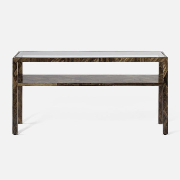 - Our Brindley console's elevated lower shelf shows off the material's mature and striking nature.