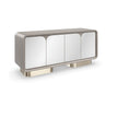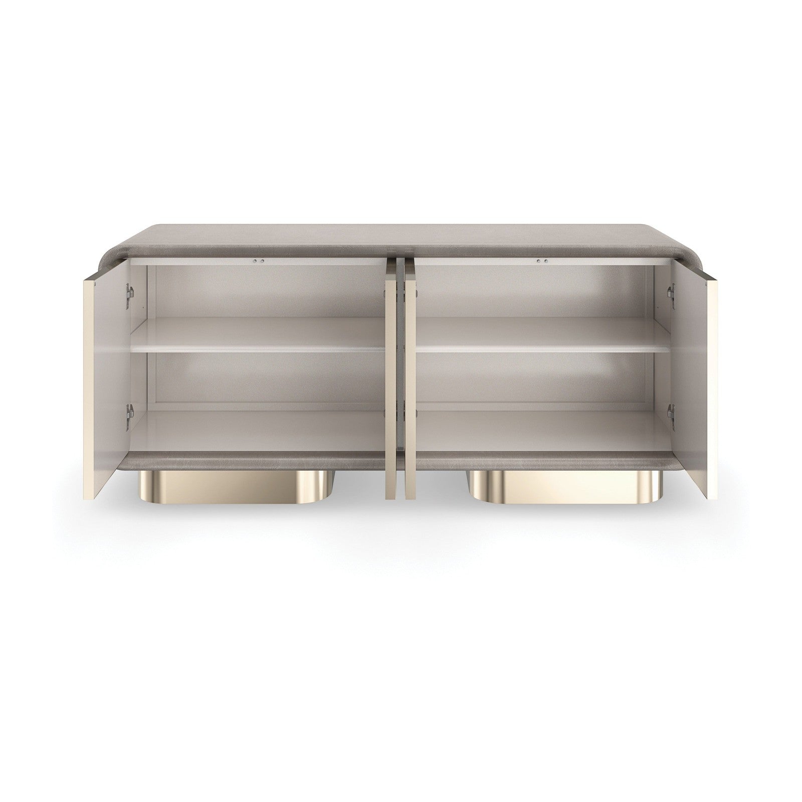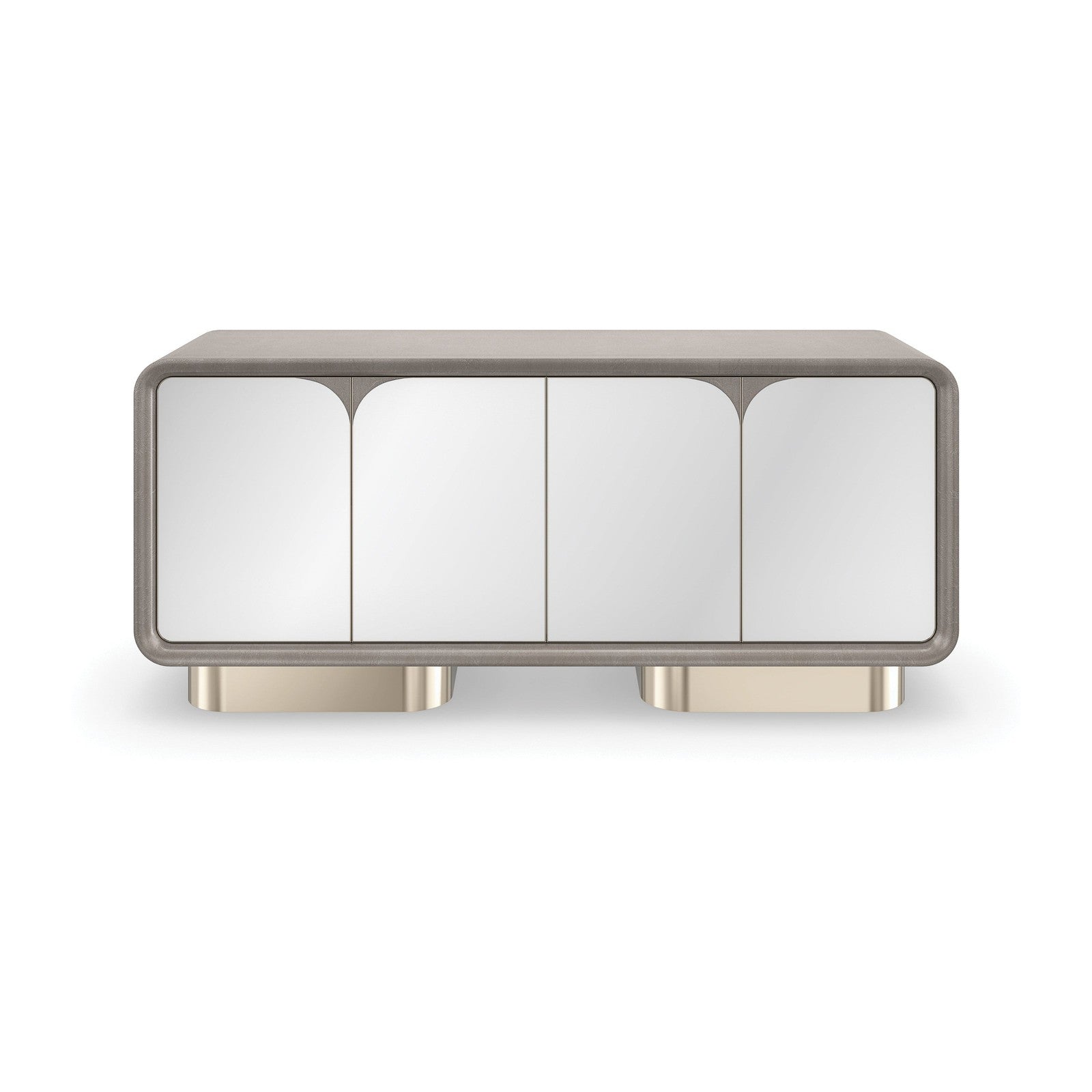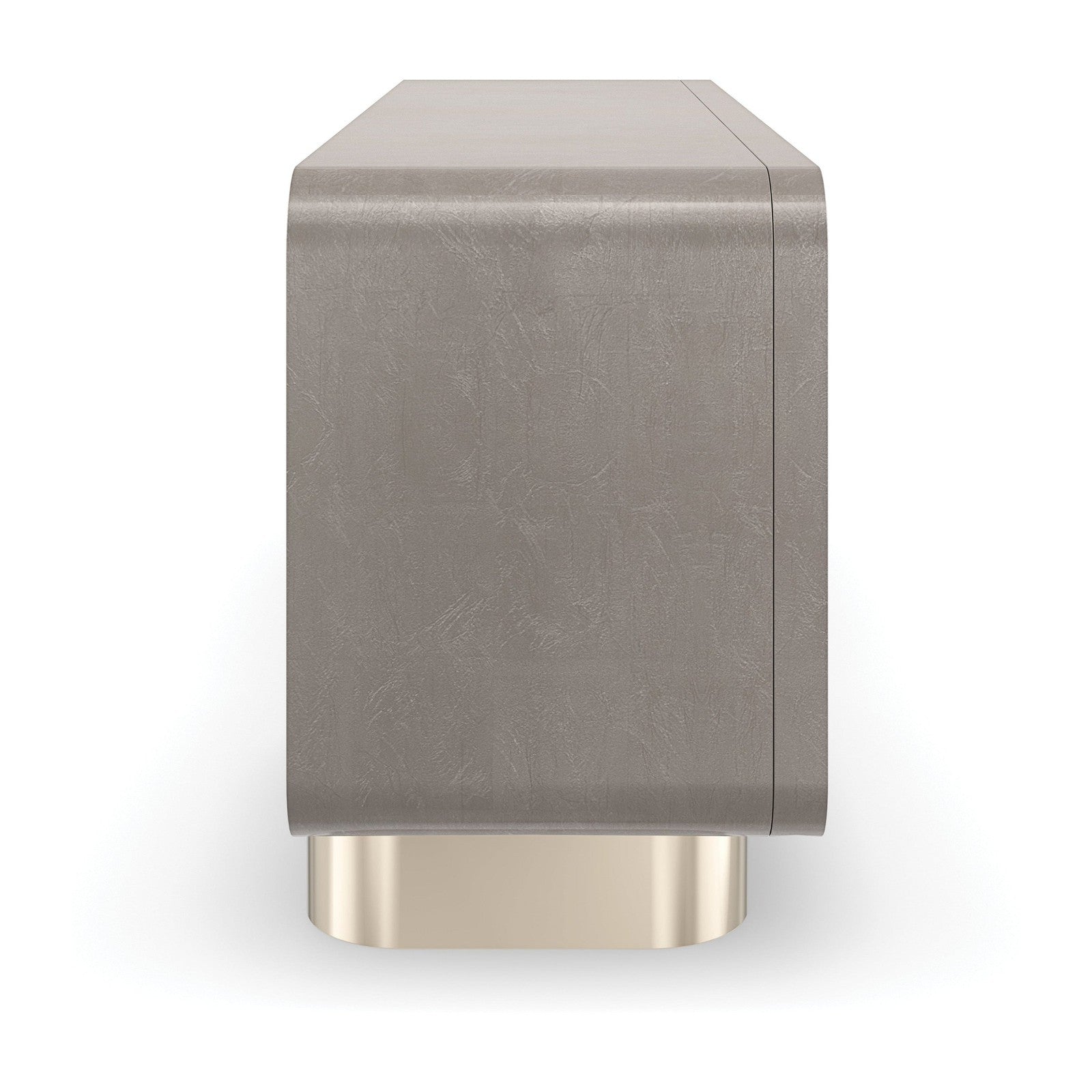 - At the pinnacle of form and function, this media console takes inspiration from the arcing paths traveled by celestial bodies, with smooth, rounded edges that reinforce its aerodynamic aesthetic.