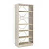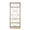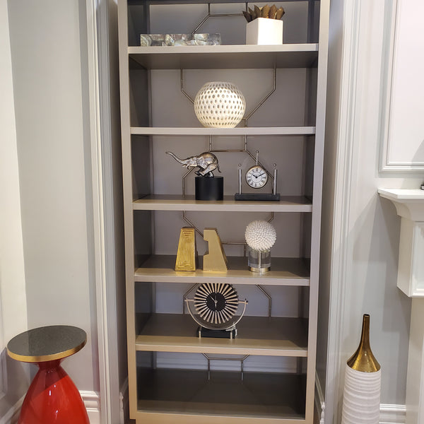 - Back-painted glass in a Taupe Metallic distinguishes the interior of this five-shelf display piece.