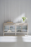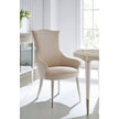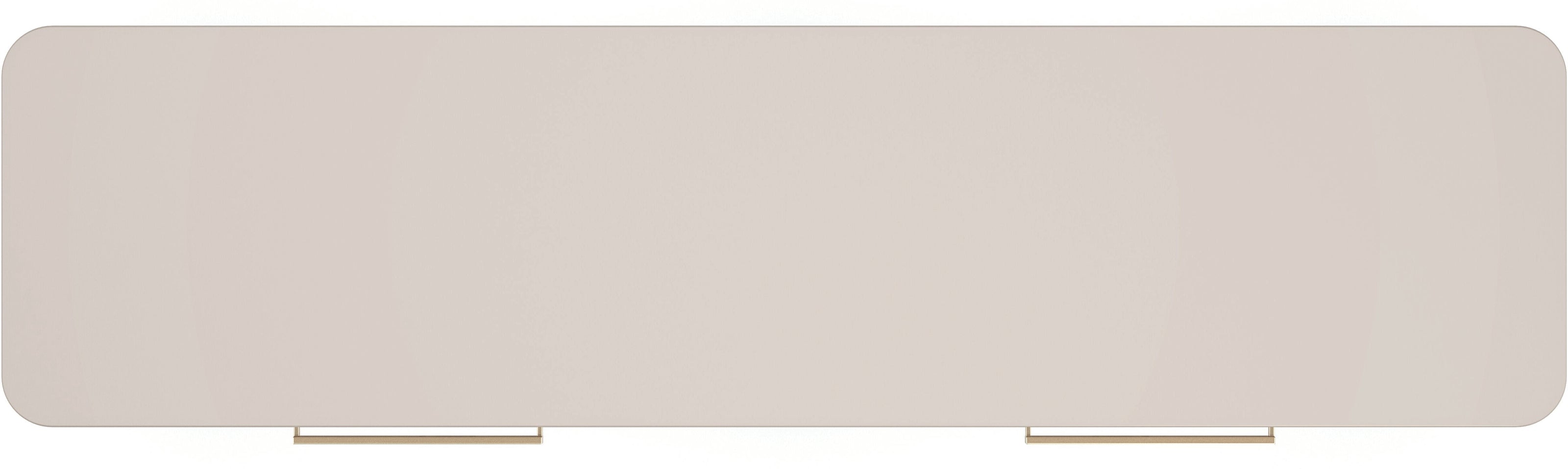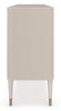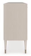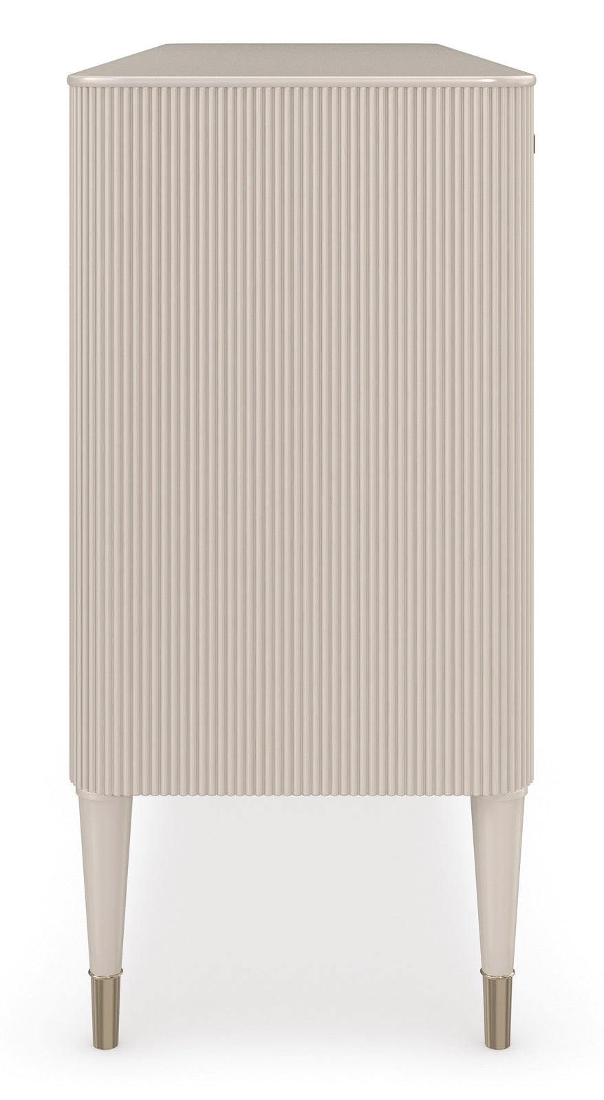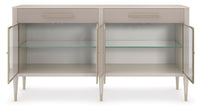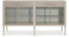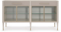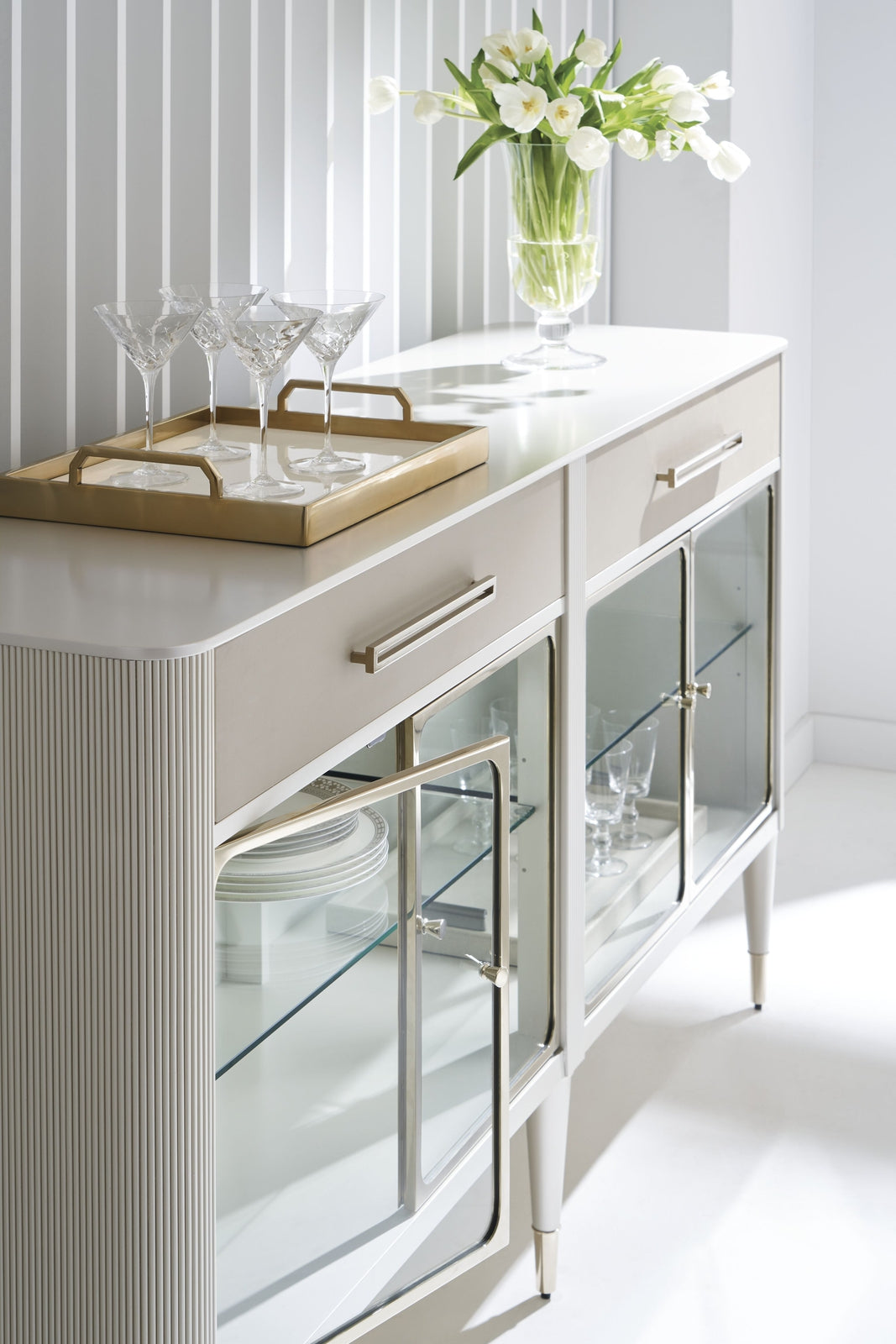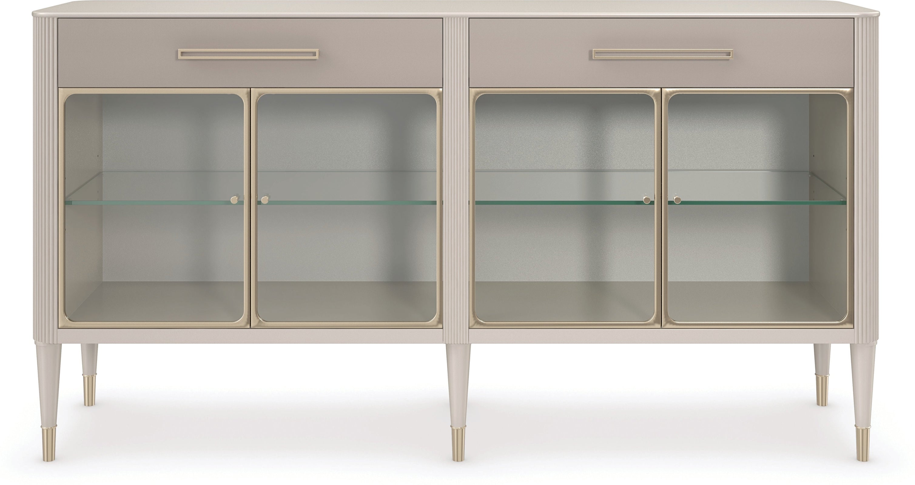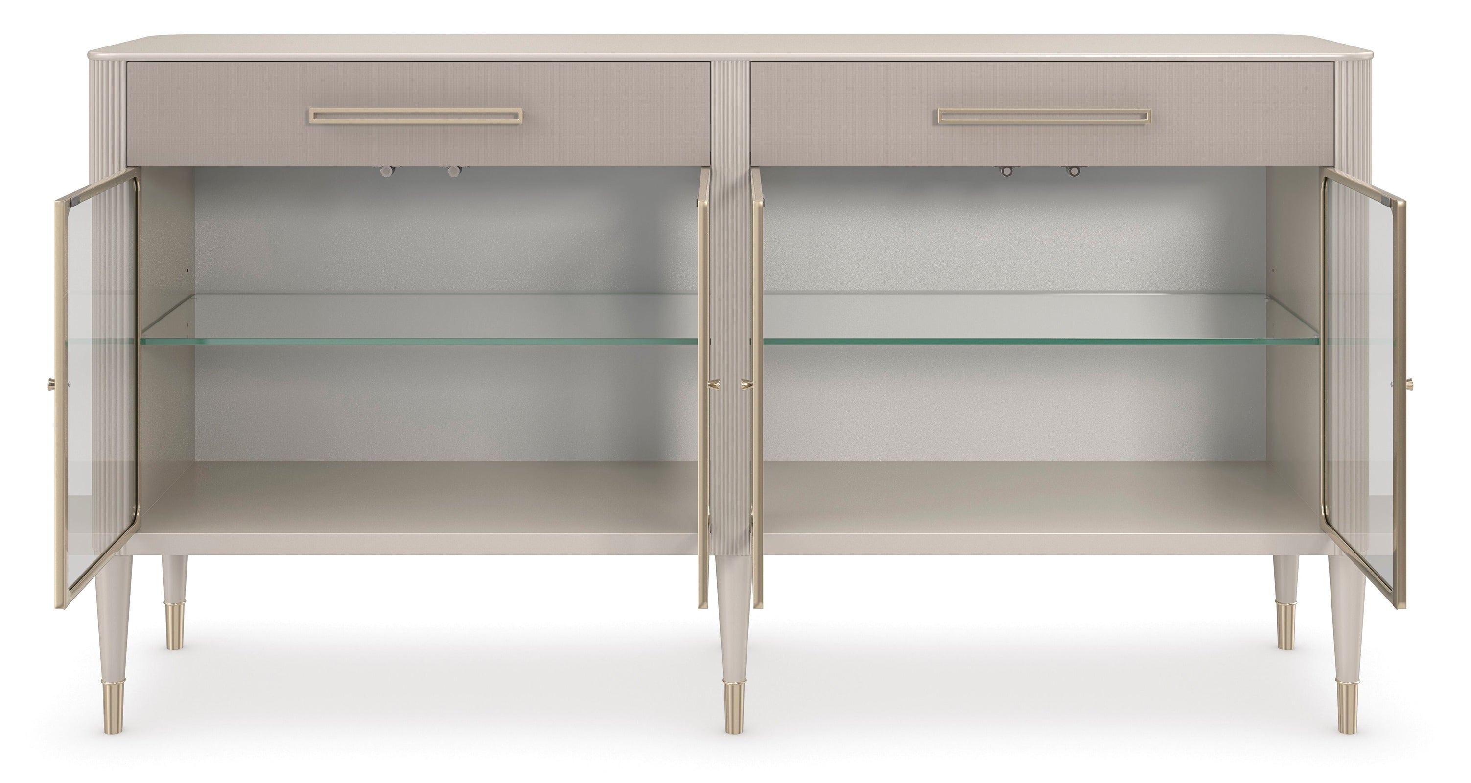 - A 74” buffet or display piece has four glass front doors and a reeded frame finished in Matte Pearl.