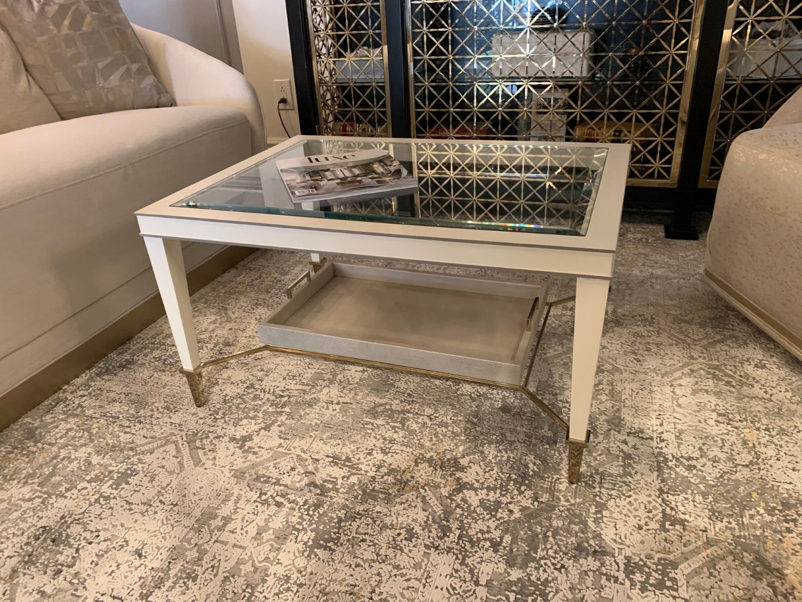 - Faux shagreen tray at bottom with Whisper of Gold handles.