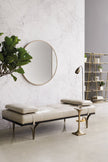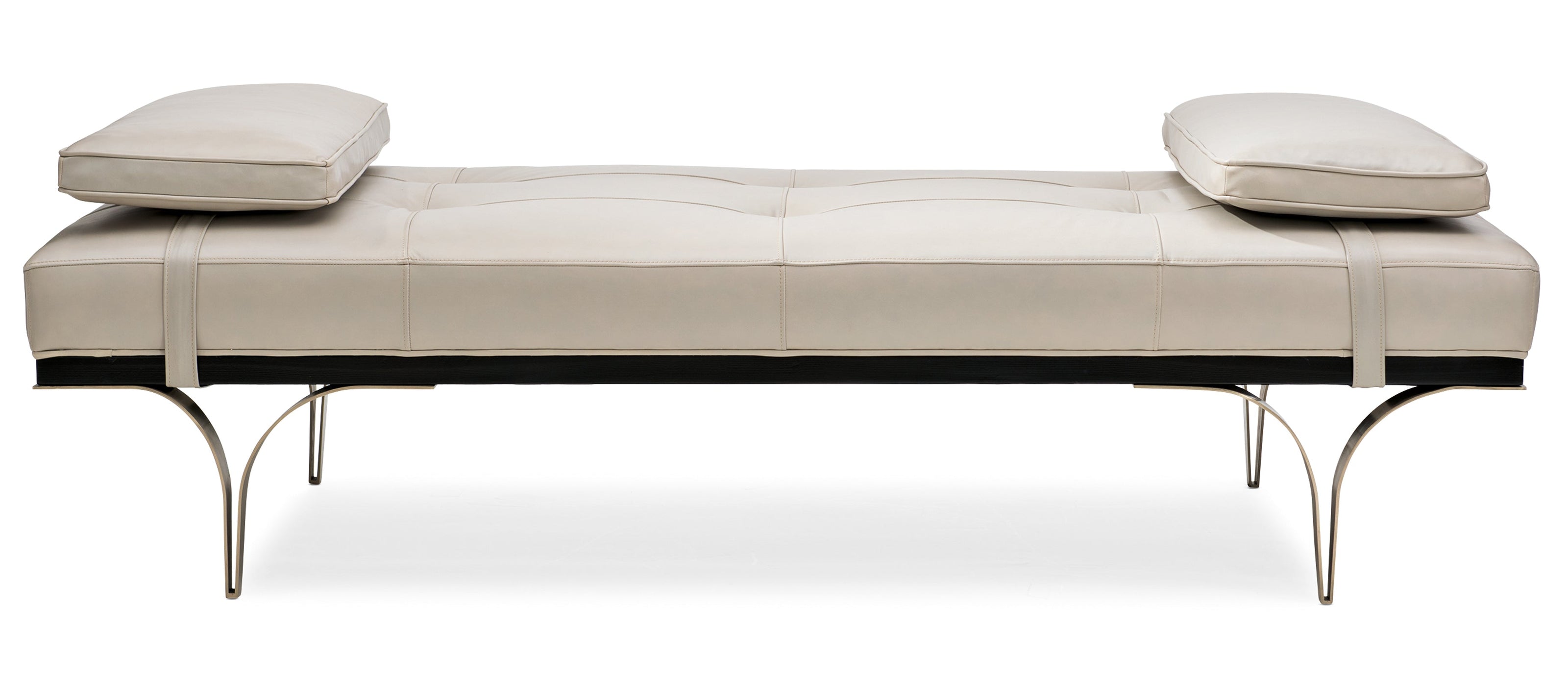 - Metal V-shaped legs finished in Whisper of Gold elevate this daybed while lending an airy openness to its overall appearance.