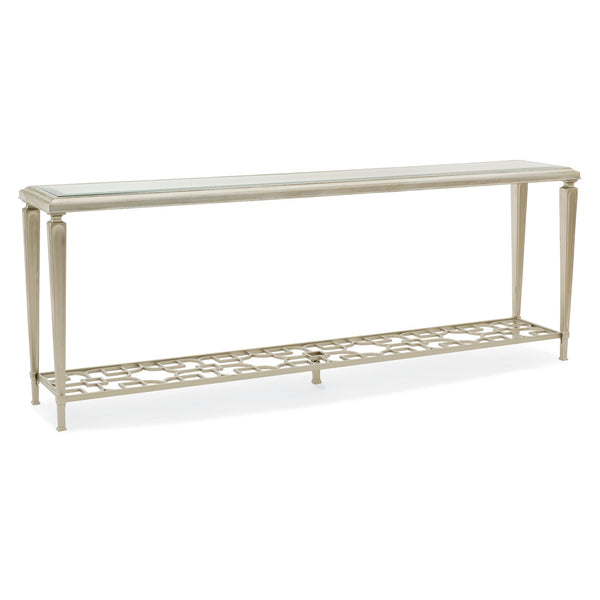- Its airy design is elegant in its simplicity and features an exquisite metal fret-patterned shelf that can be seen through its glass top.