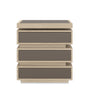 showcases Koto wood finished in Dry Martini and inset with Smoked Bronze mirrored glass. The table tiers are Koto in Dry Martini with a Neutral Metallic finish. Two soft-close drawers are fronted with bronze mirrors. Features open center storage for displaying books and objects. The plinth base is finished in Neutral Metallic paint. Hidden casters are included for ease of movement.