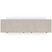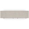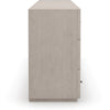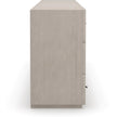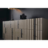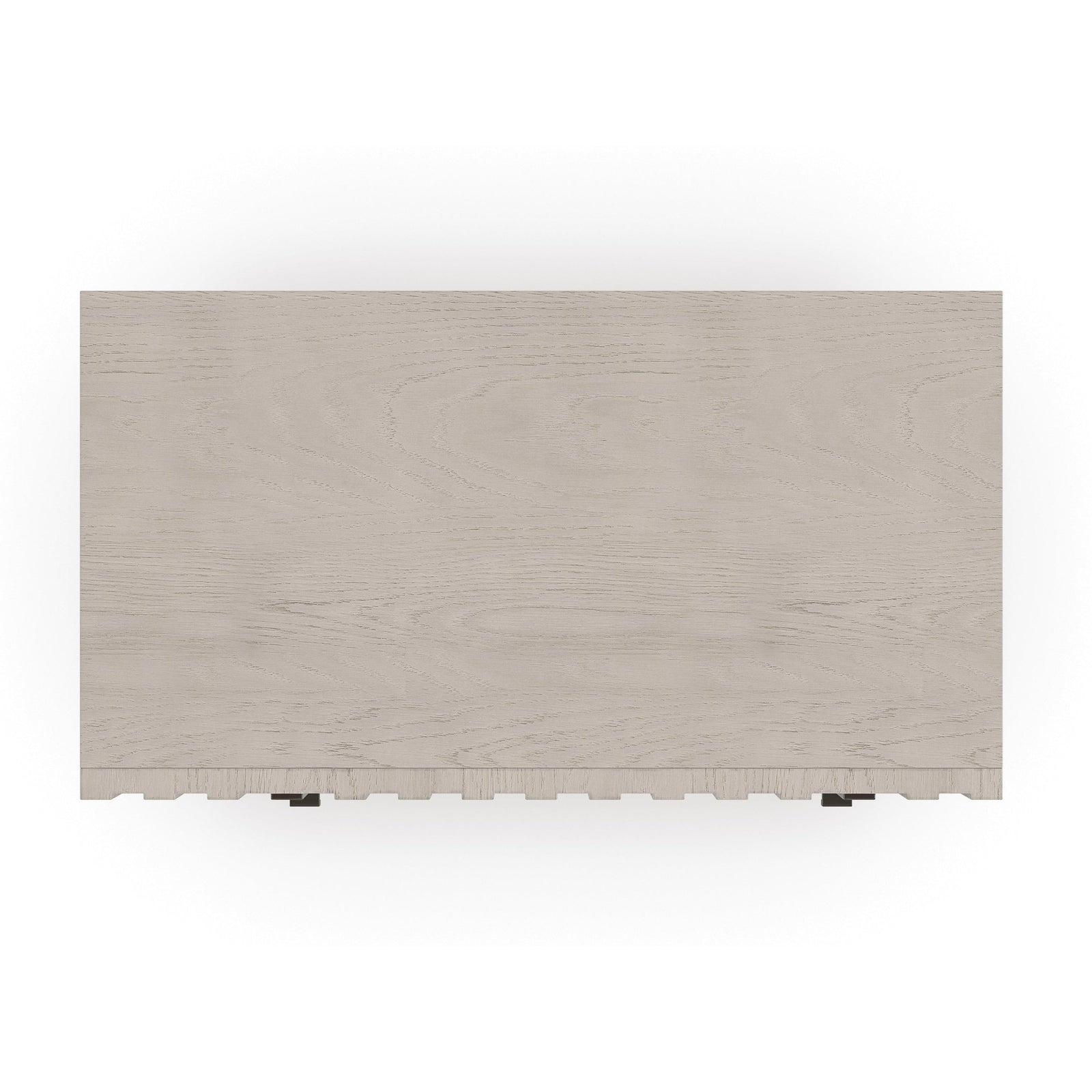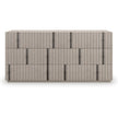- Slatted details create depth and dimension, punctuated by open-grain oak in a neutral taupe finish.