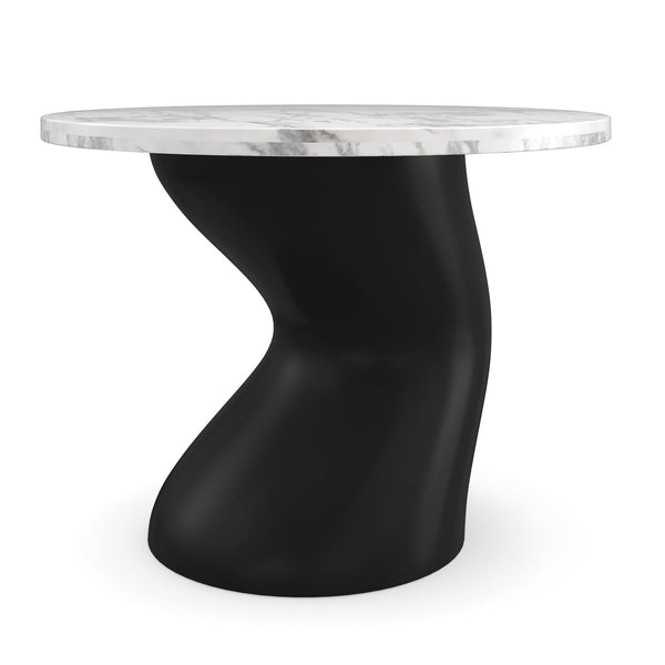 - A captivating centerpiece in any interior, this dining table introduces timeless elegance with a modern aesthetic. Features a luxurious stone tabletop, beautifully balanced on a curvy, matte black base for striking contrast and visual appeal. Perfectly scaled for urban spaces and more intimate dining experiences.