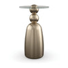 - Features a clear glass top, perfectly poised atop a sculptural base finished in Lucent Bronze Metallic paint.