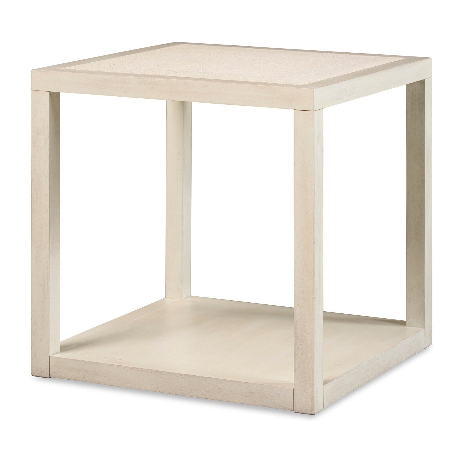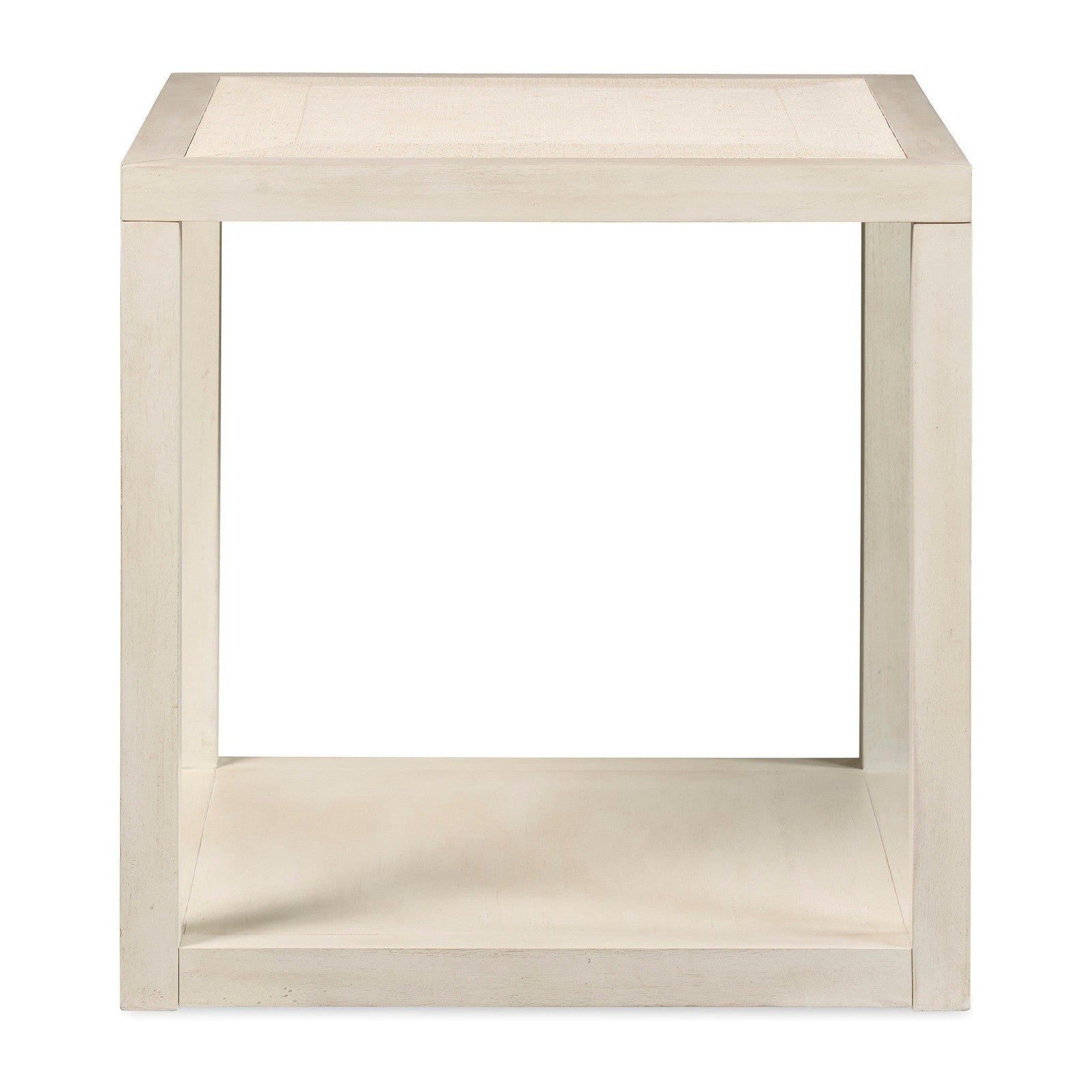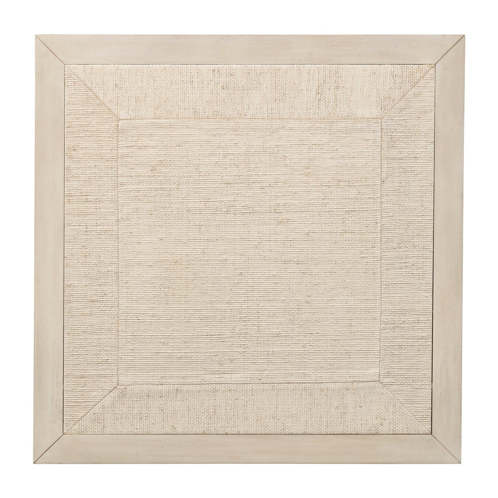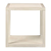 - Wire brushed Gmelina solids and veneer with natural saguran top and open shelf below finished in an off-white color