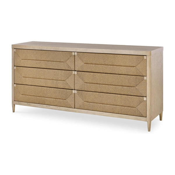 - A light, grey wash wood frame featuring geometric drawer front panels woven out of abaca rope with touch latch