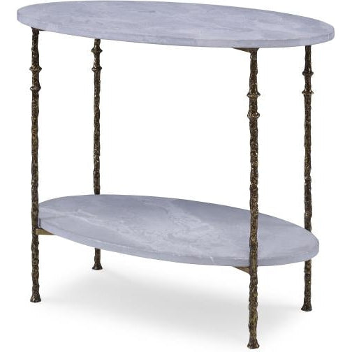 - Aged patina finish cast bronze base with White scagliola top & shelf