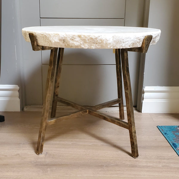 - Inlaid crystal stone top with Bronze finish metal base.