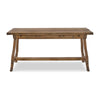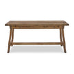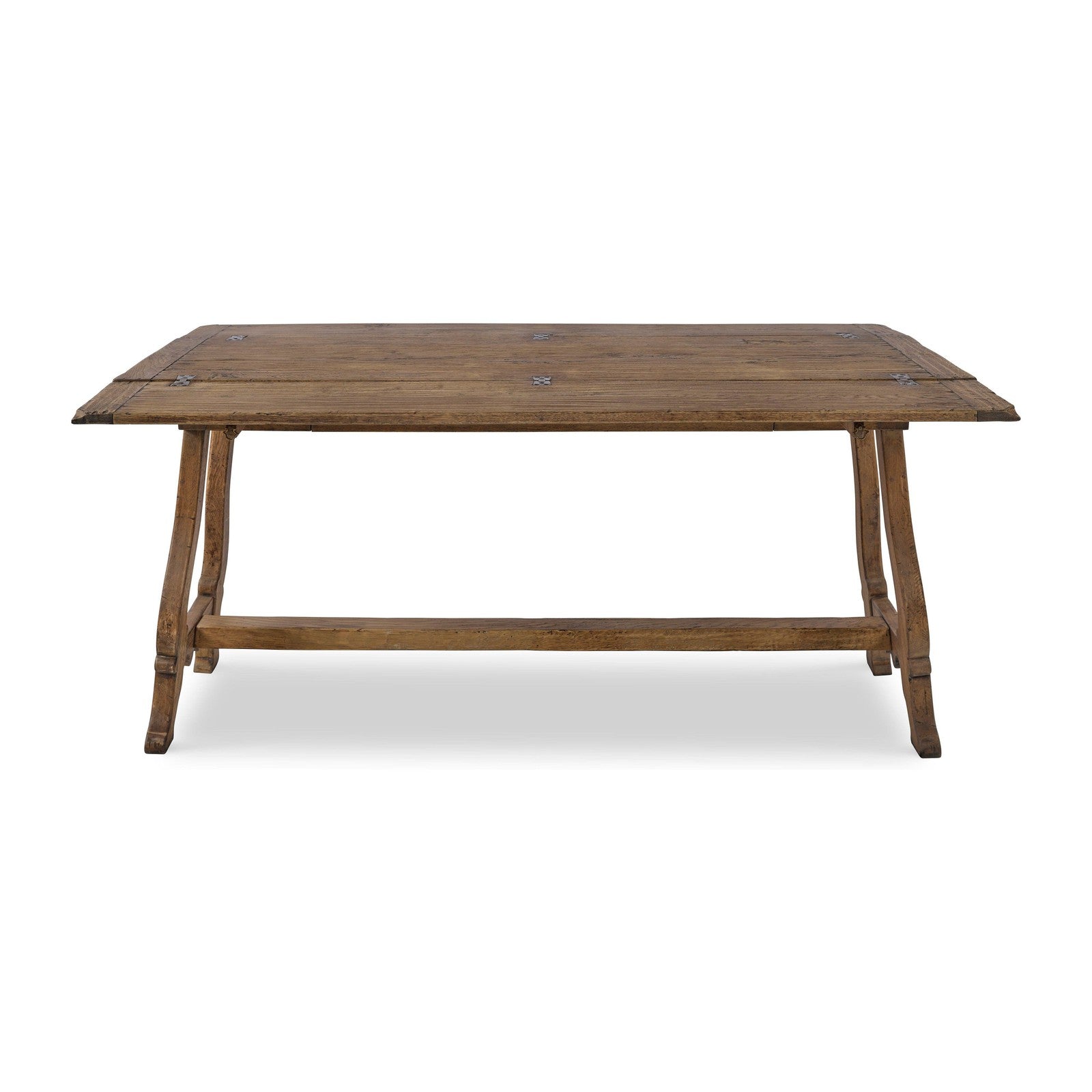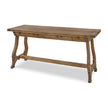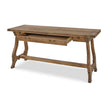 - Two slightly splayed bases supported by a center stretcher support a top with a large center drawer that is embellished with two antique brass bail pulls.