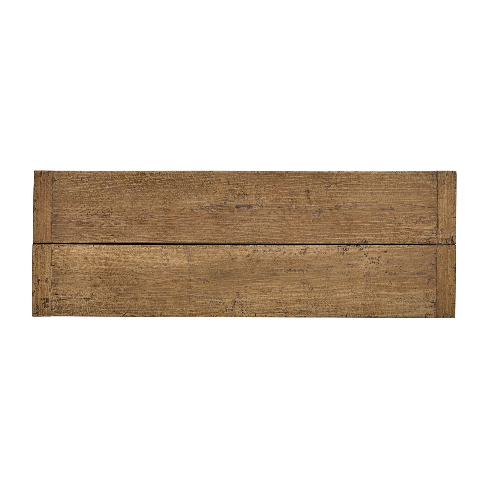 - Oak solids and veneer in a highly distressed and aged natural finish