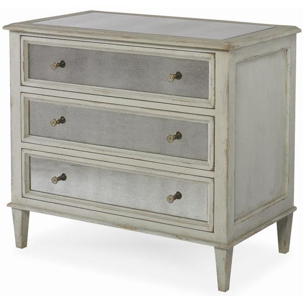 - The Madeline Nightstand features Eglomise glass drawer fronts and top, tapered legs and an antiqued Swedish grey worn paint finish.