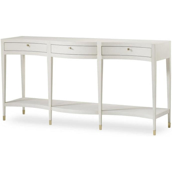 - Features include elegant sweeping serpentine front, delicate tapered legs with satin brass finish ferrules and three drawers with brass finish key with keyhole hardware.