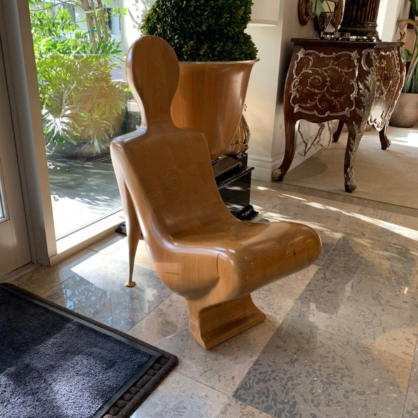 - A natural wood figure transformed into a surprisingly comfortable modernist accent chair, beautifully hand carved with subtle brass arms. Art has never been this practical.