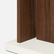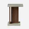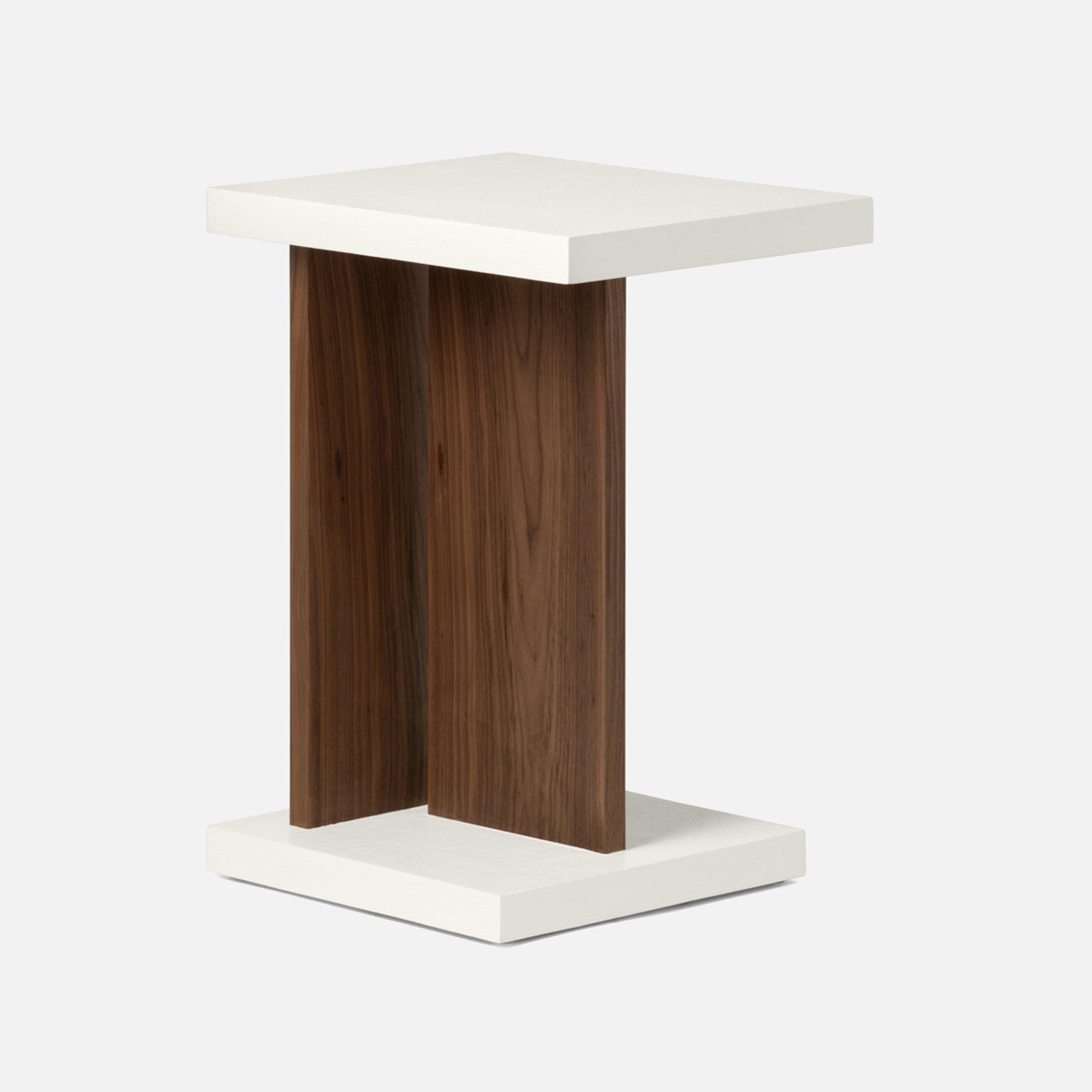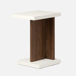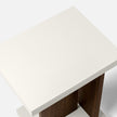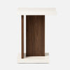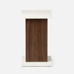 - The contemporary Corvin accent table has a warmcolored, textured raffia top and base with contrasting wood grain-patterned panels.