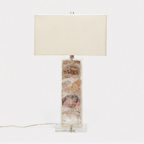 - Large rounds of capiz shell laid under acrylic make the wavy, multi-hued look of the Elara.