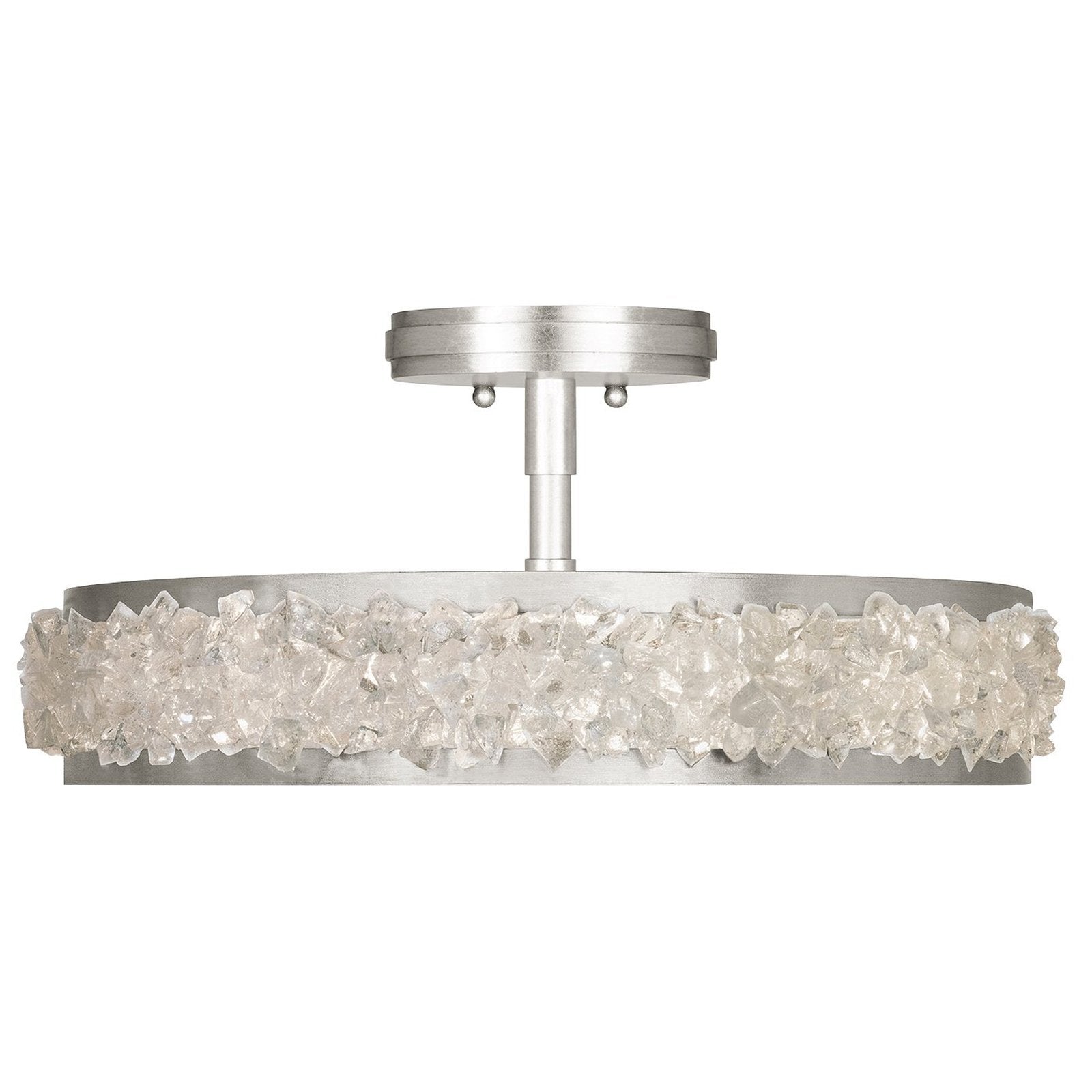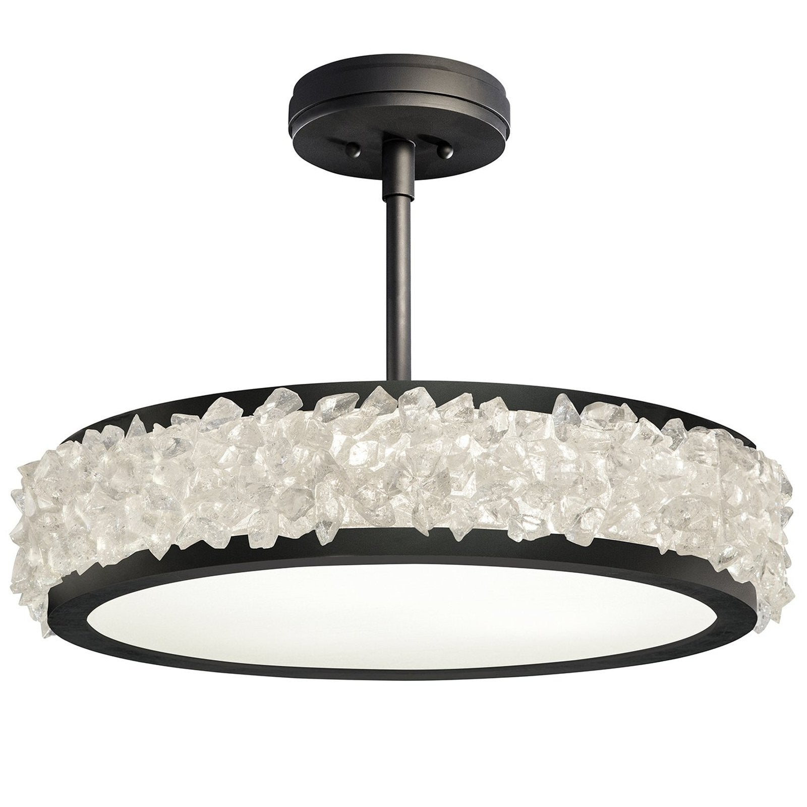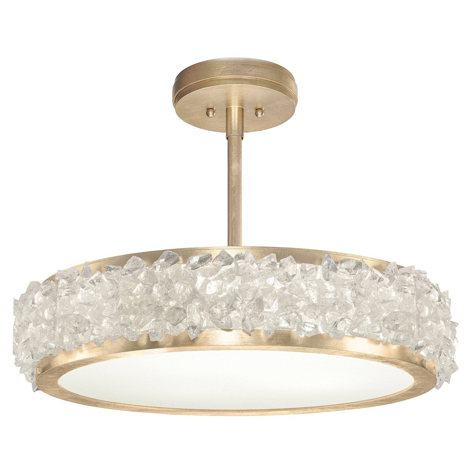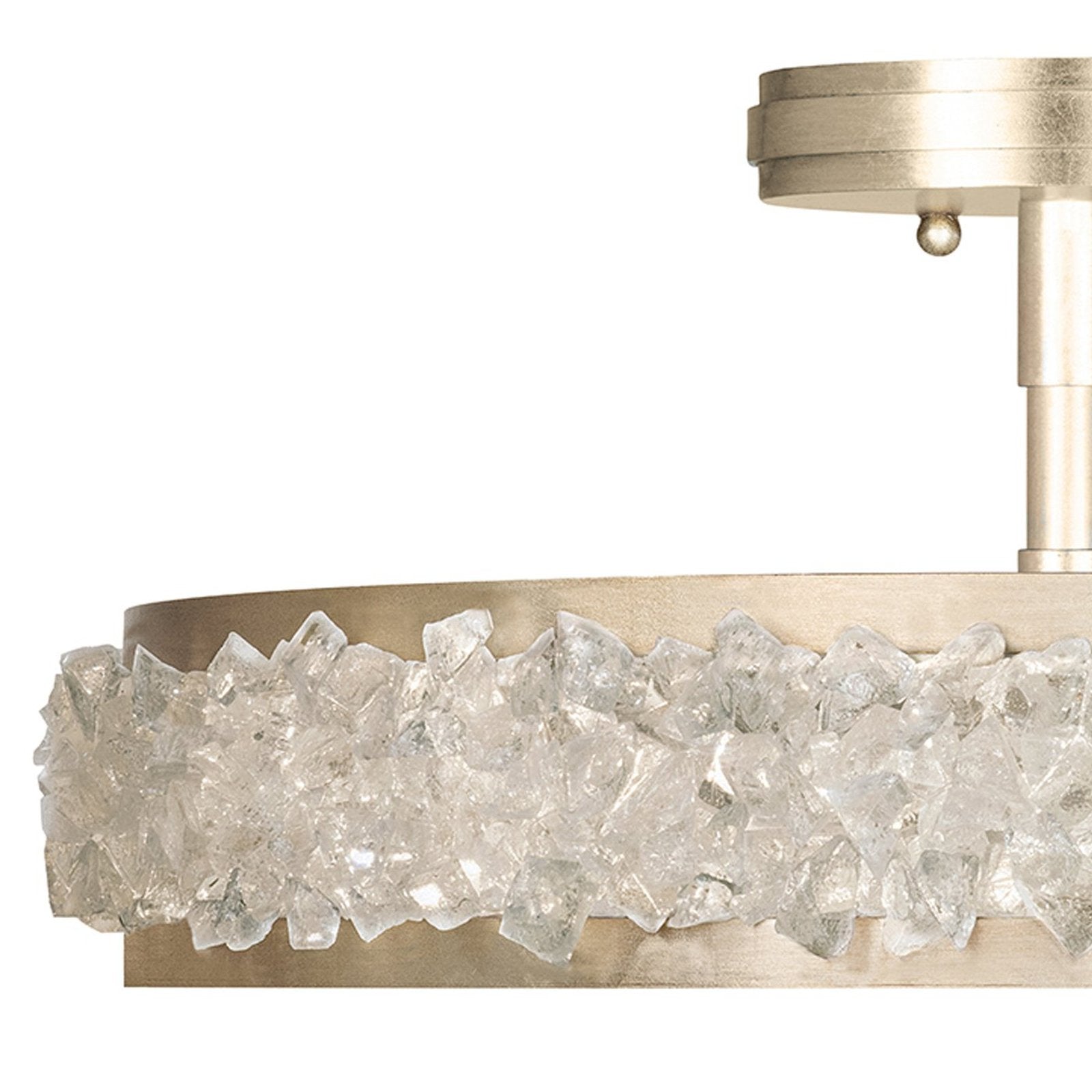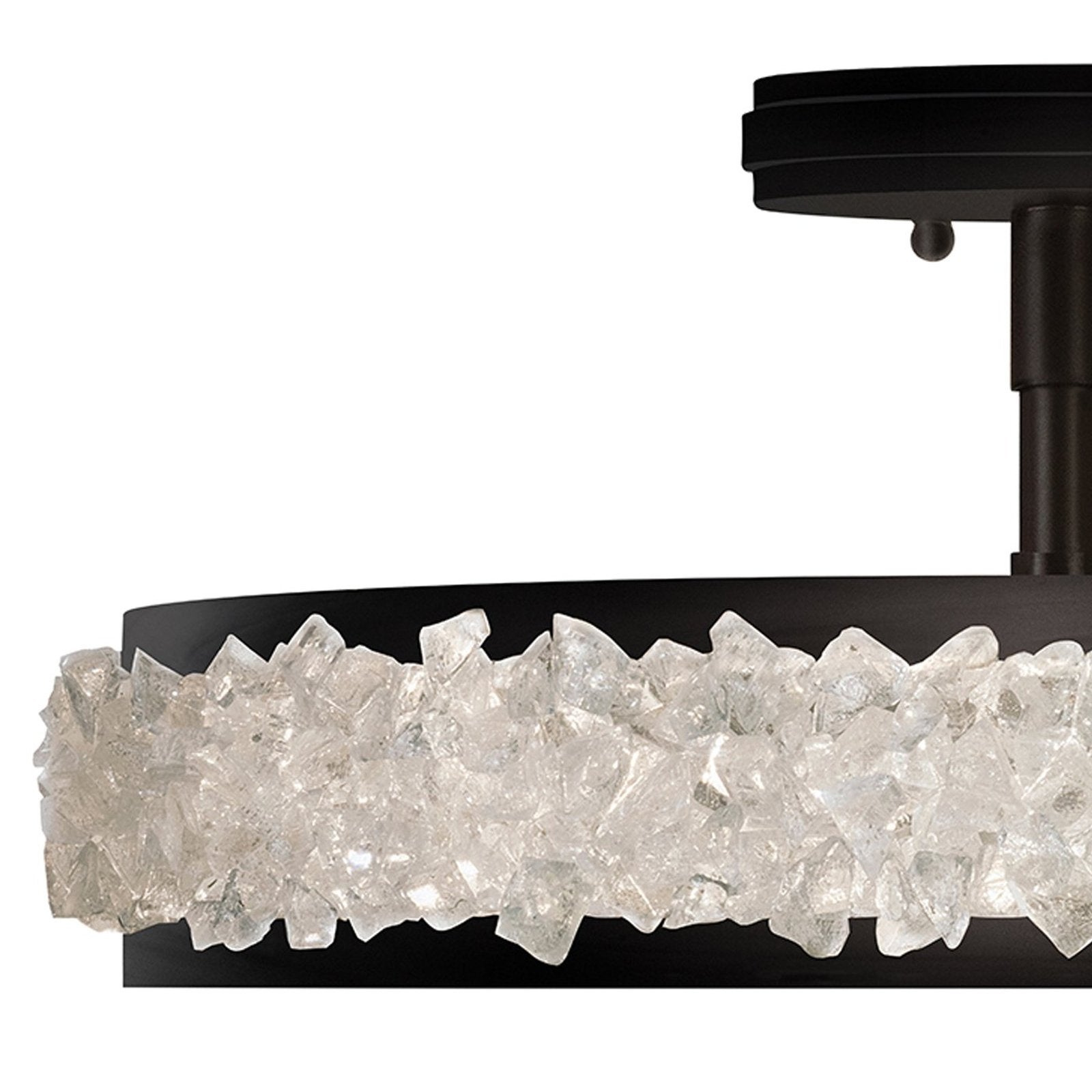 - Semi-flush in a matte black / champagne tinted gold leaf / platinized silver leaf finish featuring hundreds of rough cut crystal glass gems that refract light in a manner reminiscent to the cirrus clouds ice crystals that form the lunar halo in the frozen night sky.