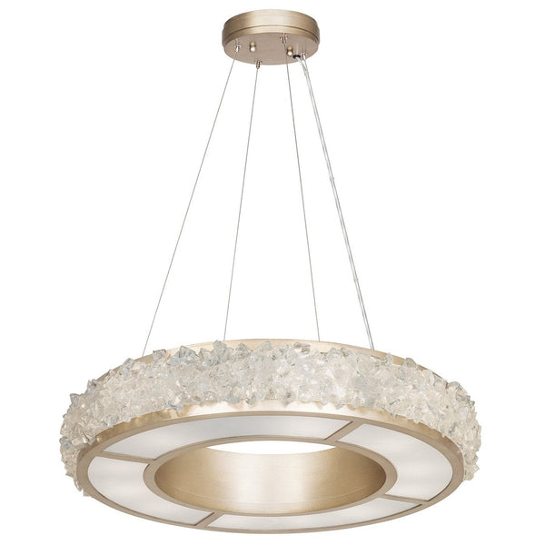 - Chandelier in a matte black / champagne tinted gold leaf / platinized silver leaf finish featuring hundreds of rough cut crystal glass gems that refract light in a manner reminiscent to the cirrus clouds ice crystals that form the lunar halo in the frozen night sky.