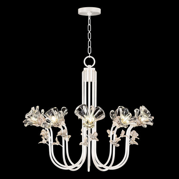 - This chandelier features a flirtatious interplay of crystal with white and gold brushed metal floral adornments creates a romantic atmosphere emanating feelings of joy and the celebration of life.