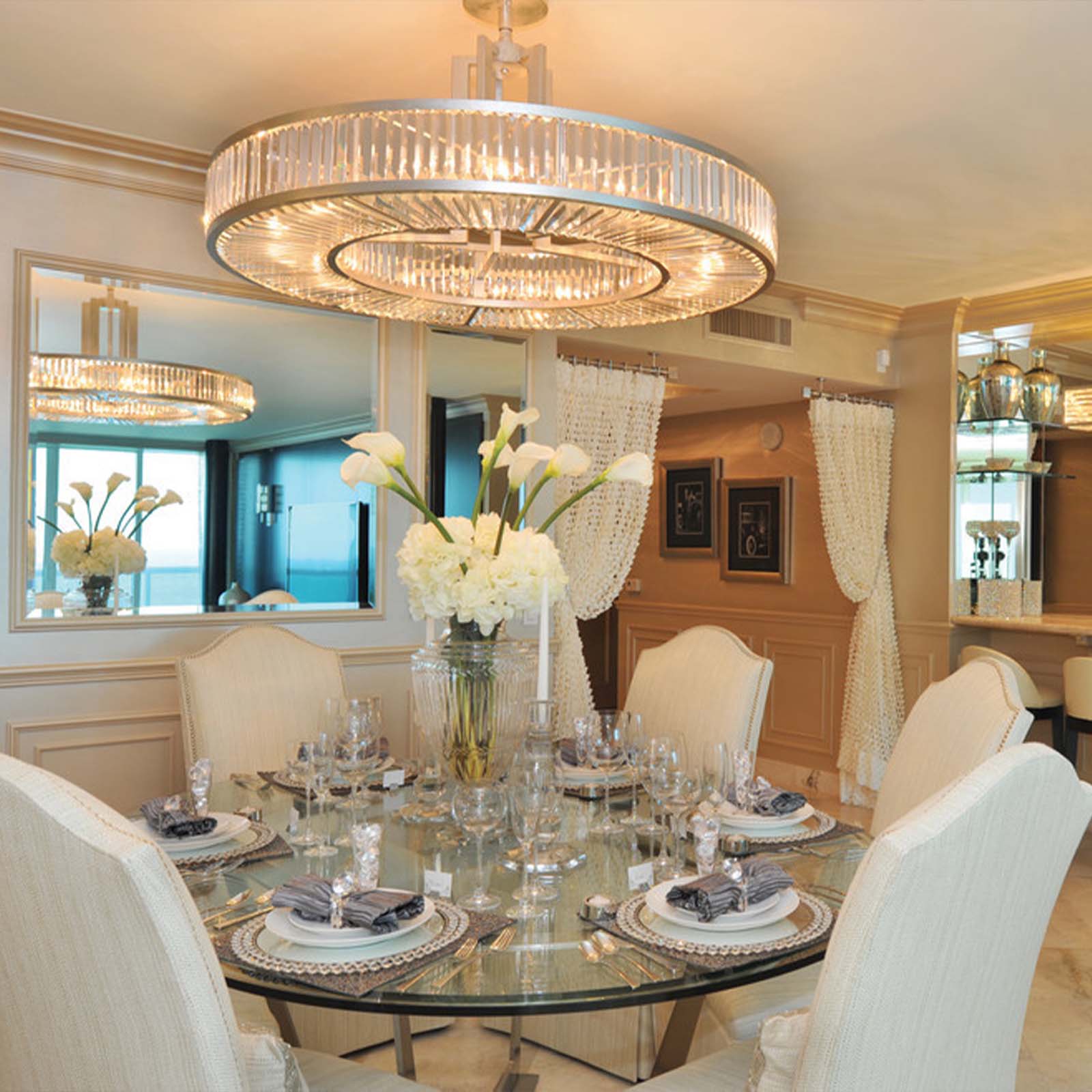 - Chandelier in a modern design of multi-faceted crystal panels, set in gold / silver leaf metal frames that refract light and create an enchanting aura highlighting appointments and transforming a space with extraordinary effect.