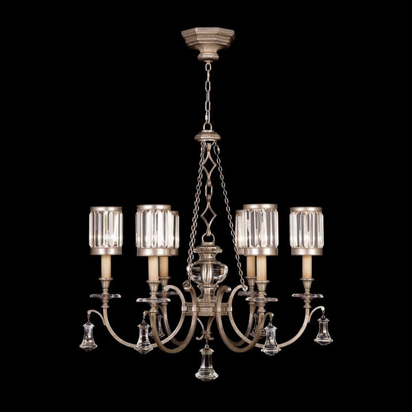 - Chandelier in a warm muted silver leaf/rustic iron finish with faceted channel set crystal shades and brilliant pendant accents.
