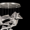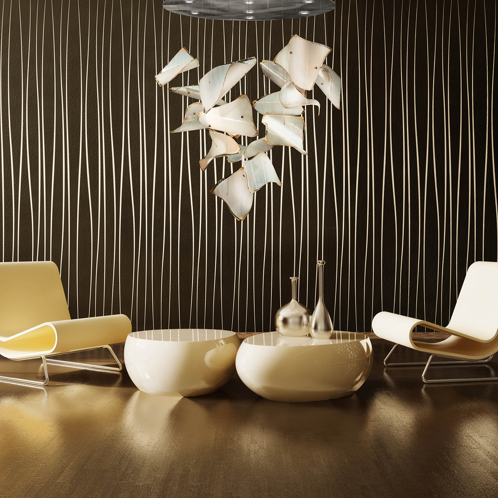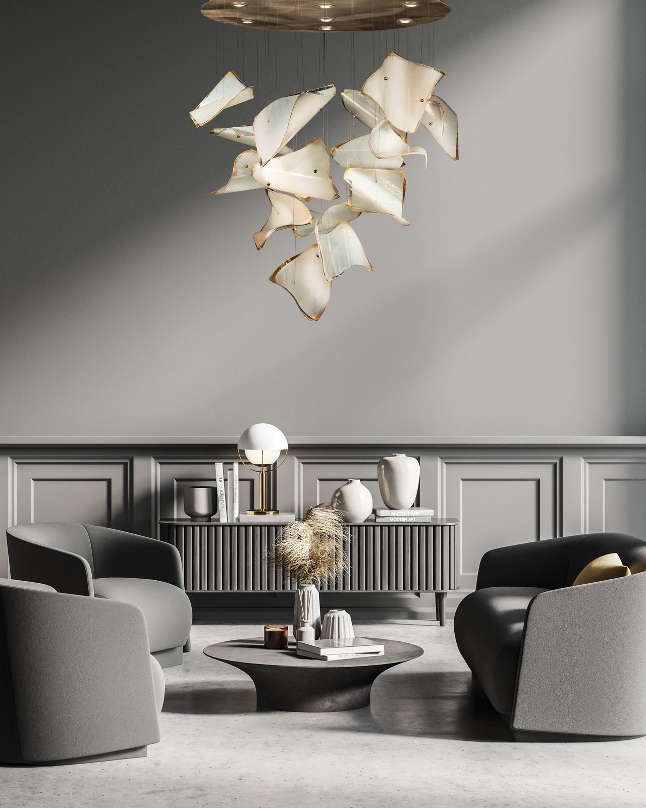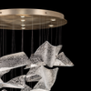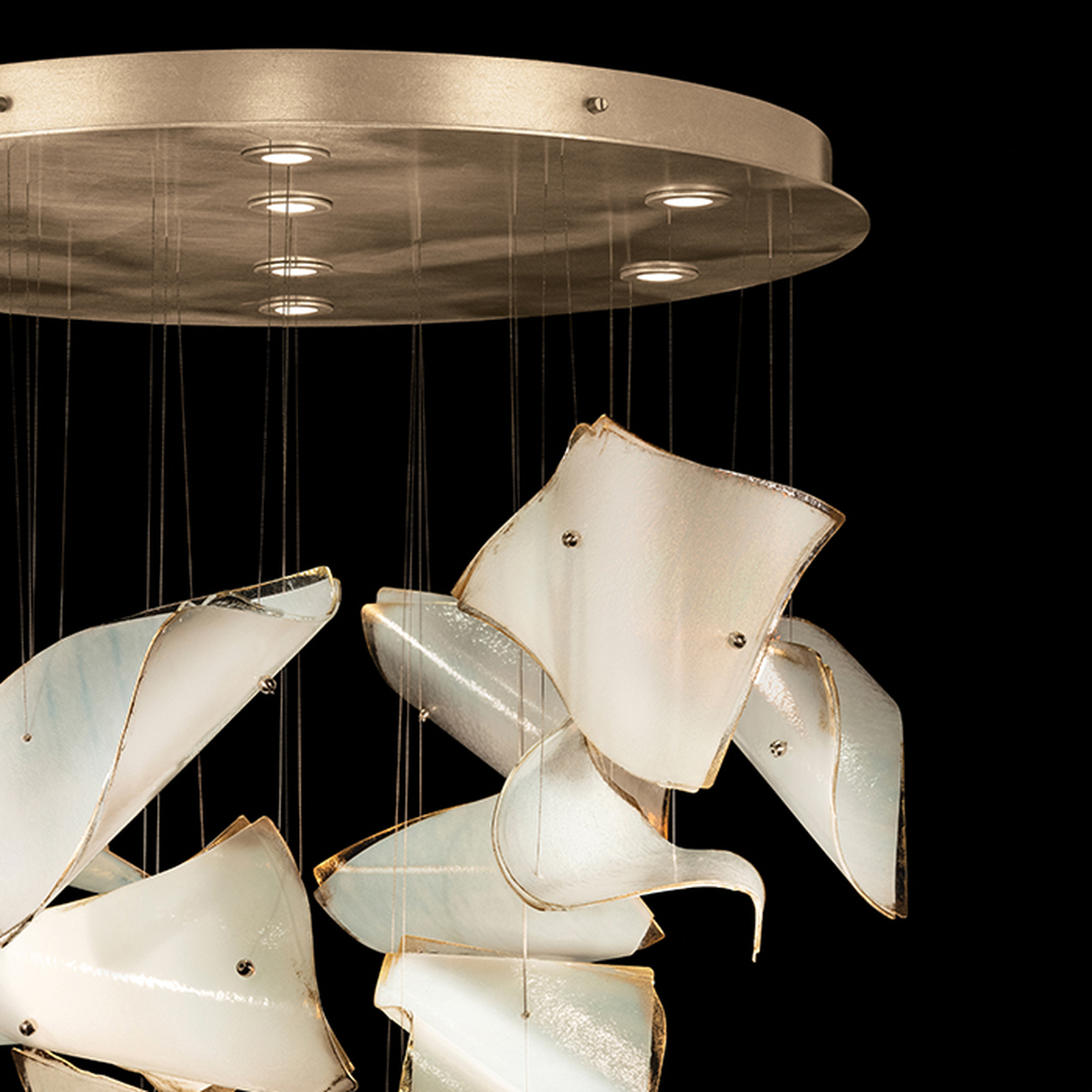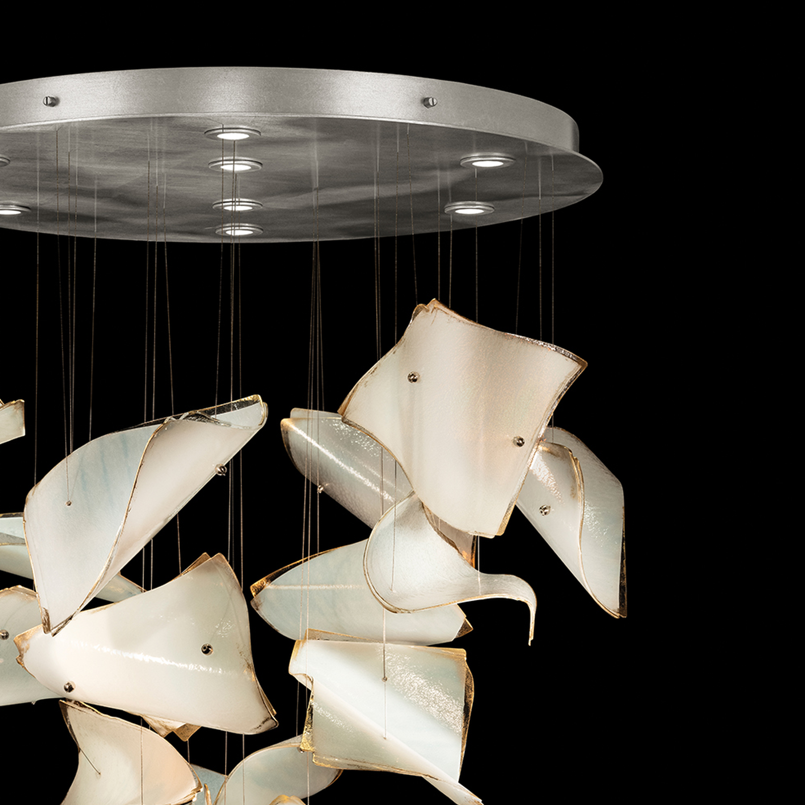 - Illuminated from a gold/silver leaf canopy and suspended by adjustable cables.