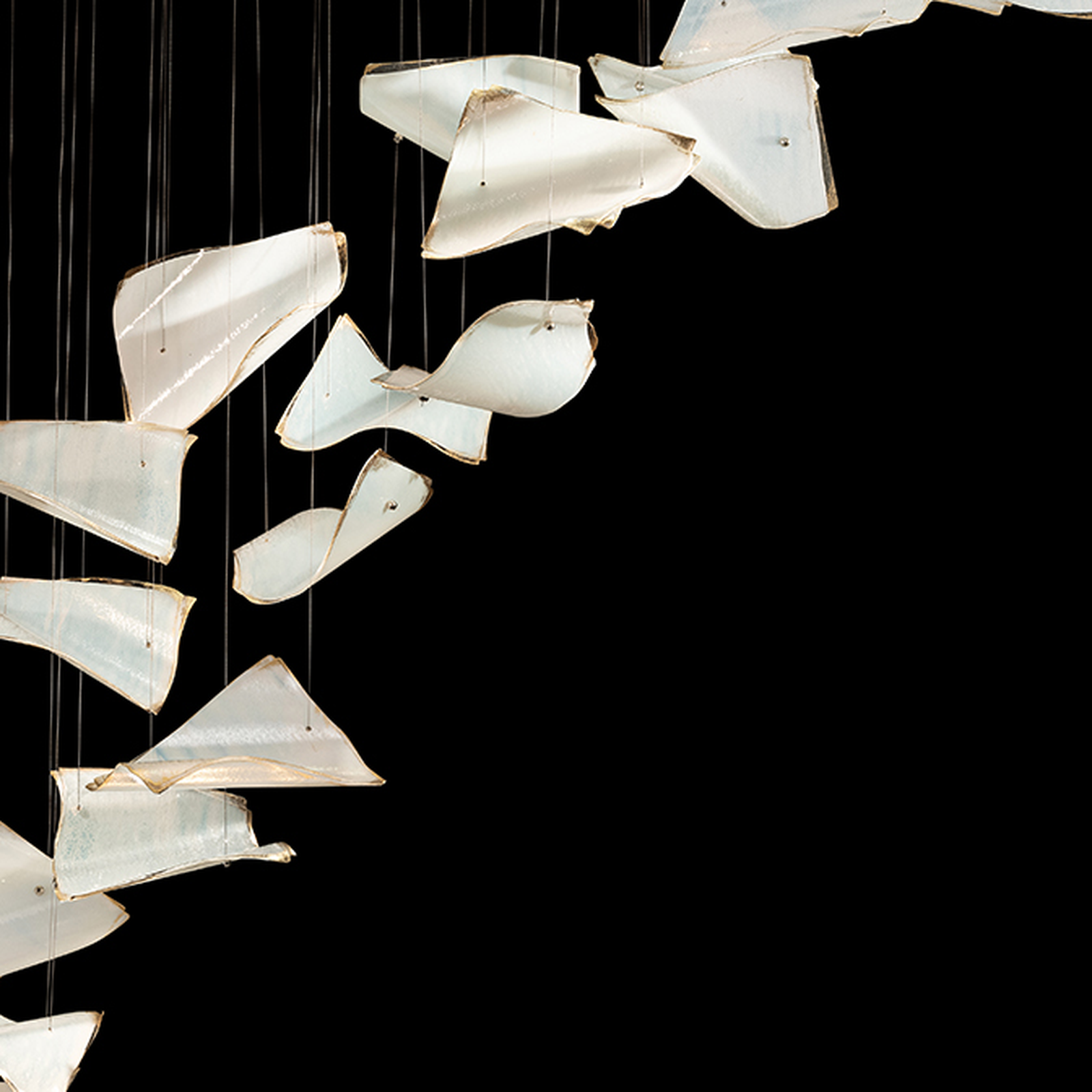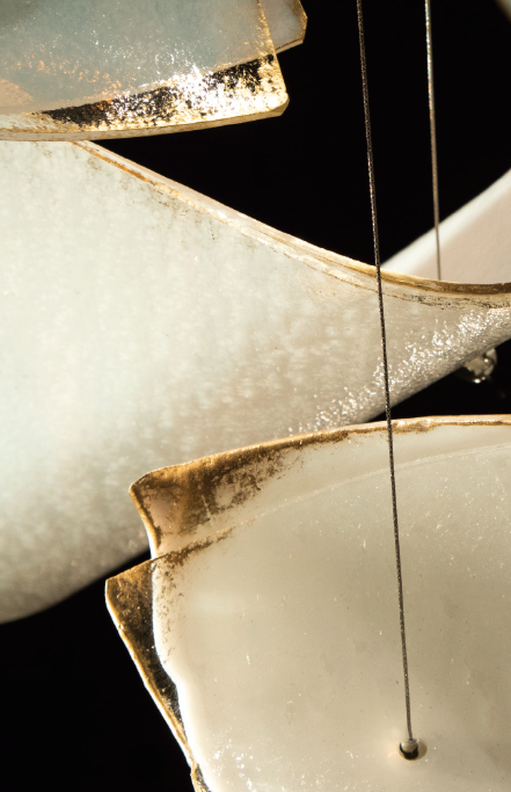 - By fusing and slumping clear and white opaline glass and hand applying gold embellishments to detail the layering of the glass, this fixture comes to life in movement and design.