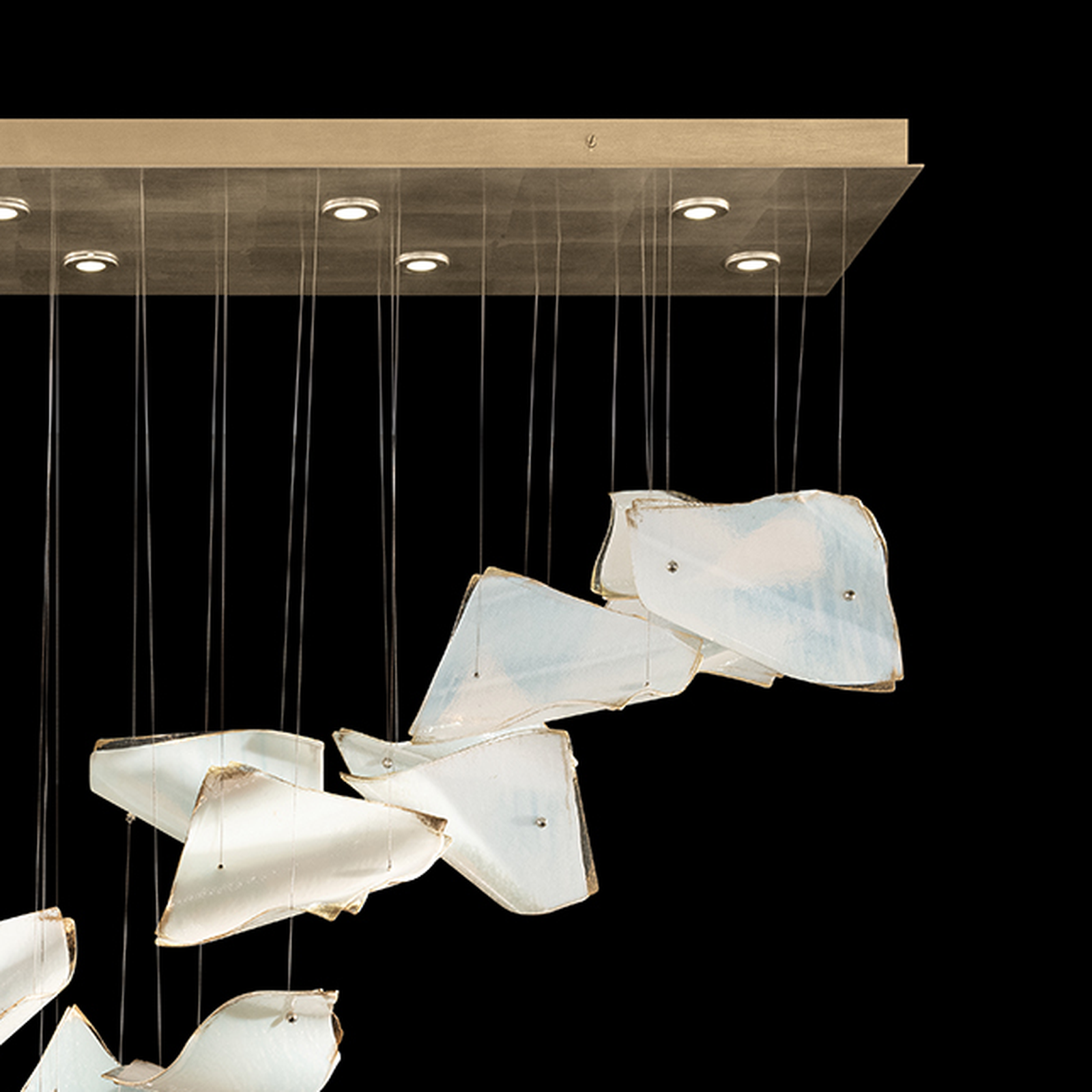 - This American handmade rectangular fixture features 20 glass “Pages” and is ideal for high ceilings. Shown in a “swoop” design.